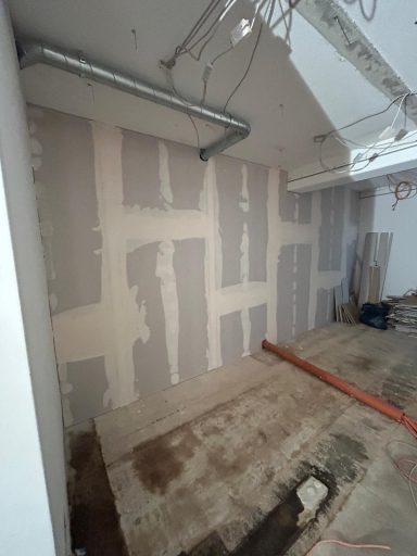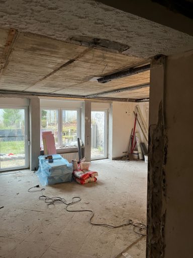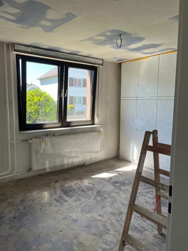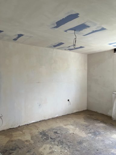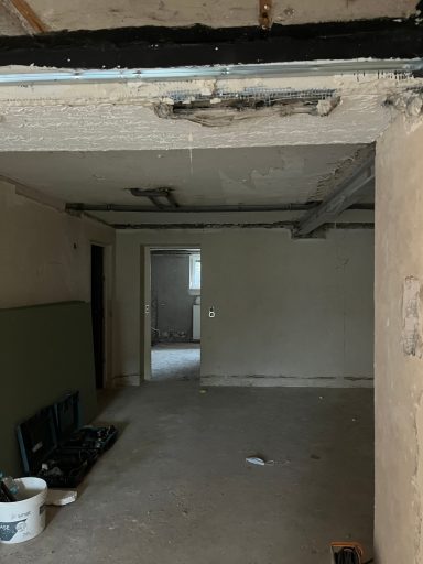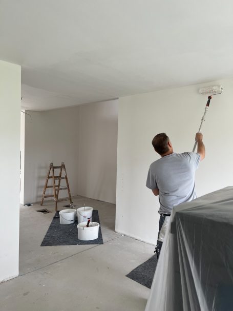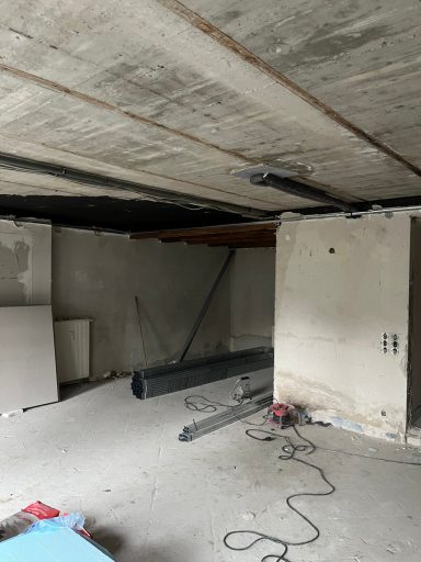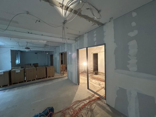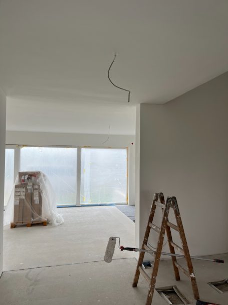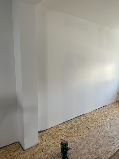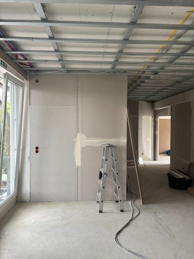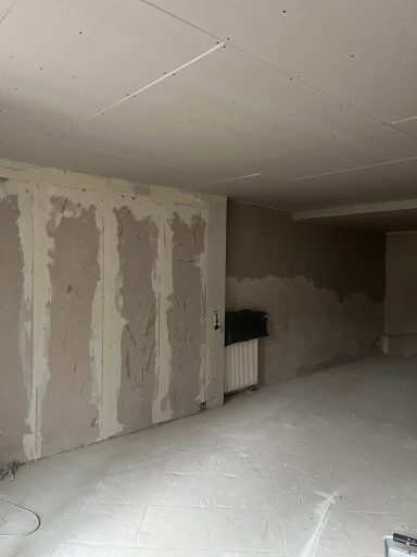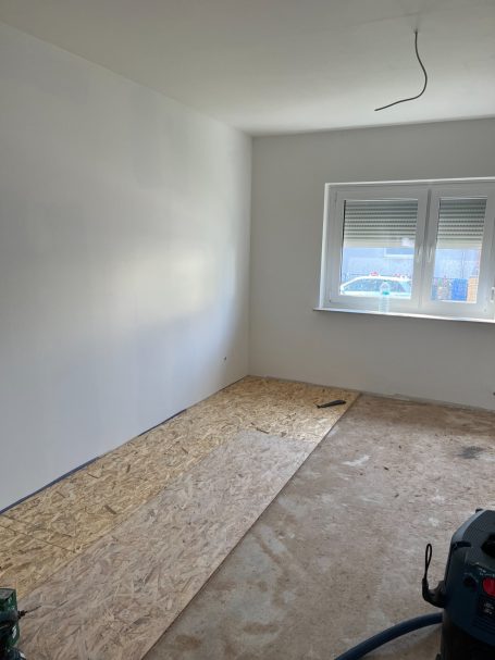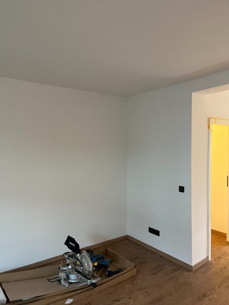 Umnutzung eines ehemaligen Lagerraums zu einer hochwertigen Wohnung: Abgehängte Gipskartondecken, Decken und Wände mit Q3-Spachtelung, Malervlies und präzisen Malerarbeiten für eine makellose Oberfläche. Der edle Vinylboden mit weißen Sockelleisten verleiht den Räumen eine warme, moderne Atmosphäre. Alles aus einer Hand – für höchste Qualität und Perfektion.