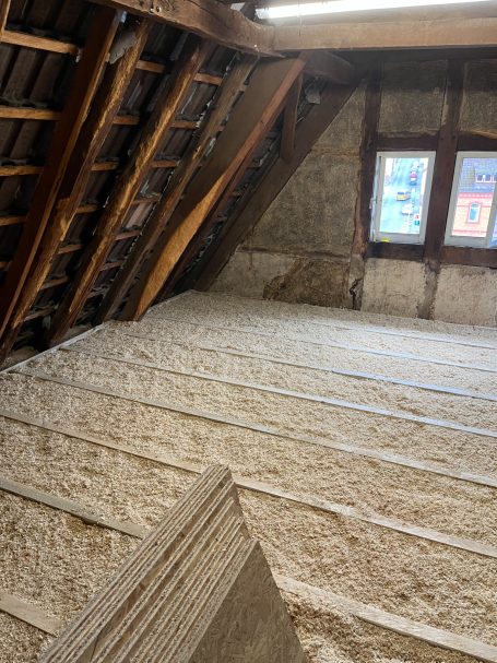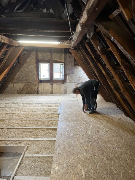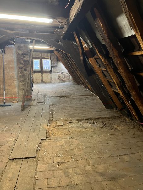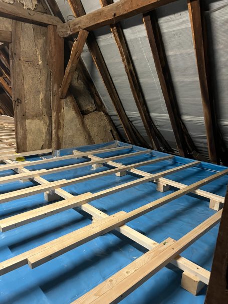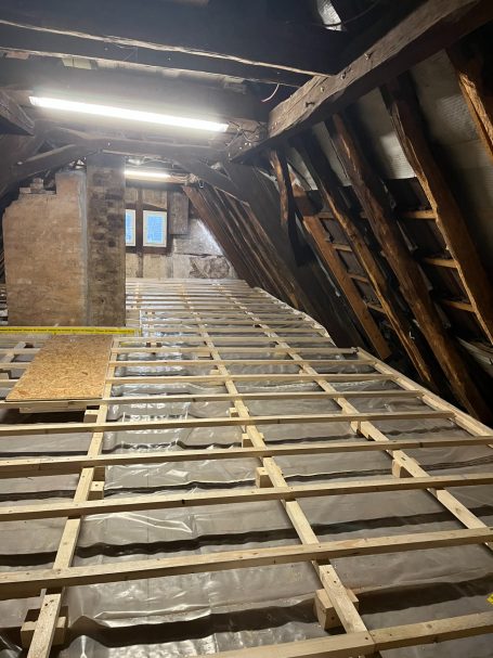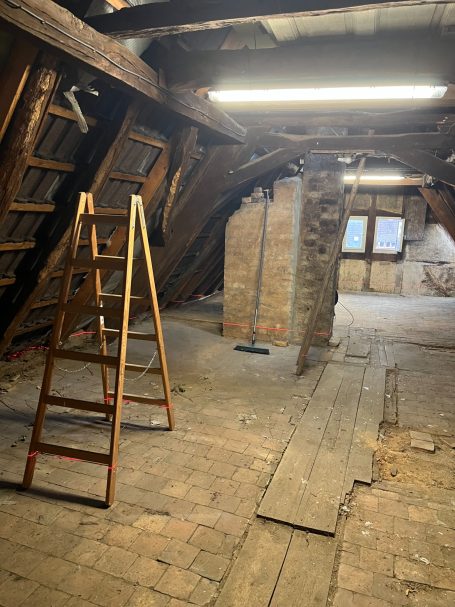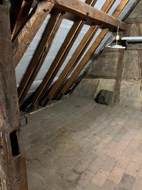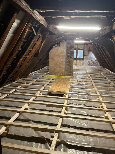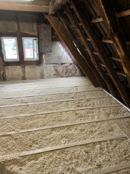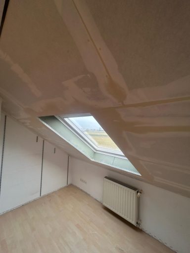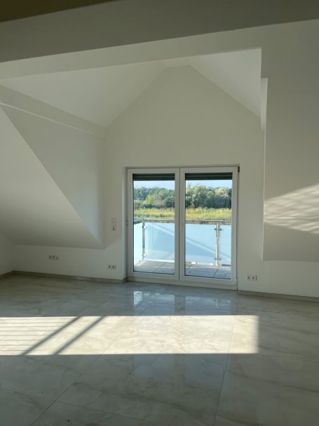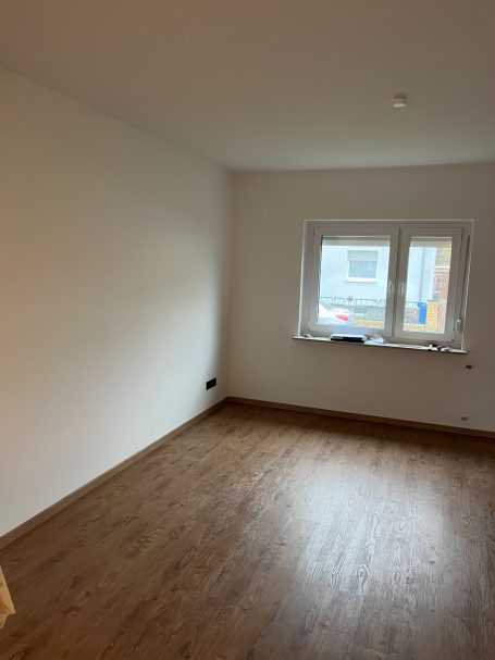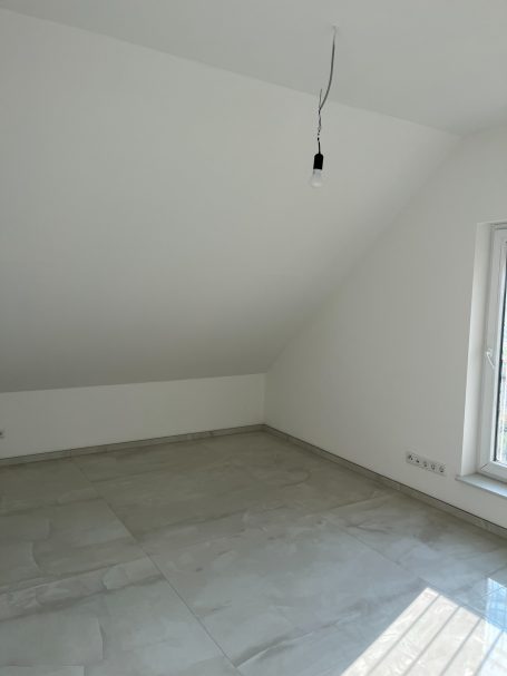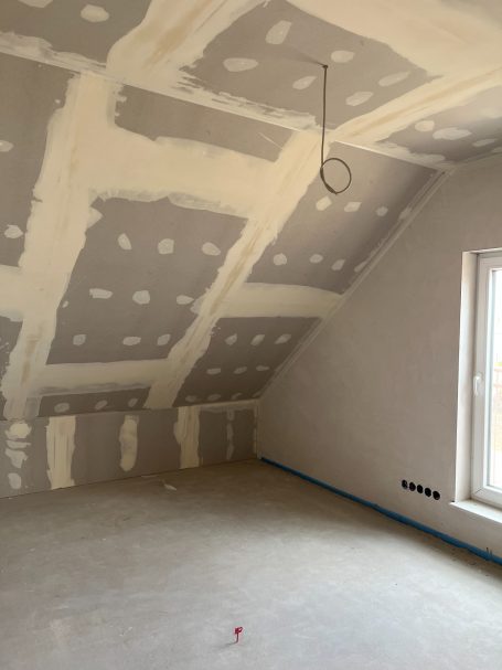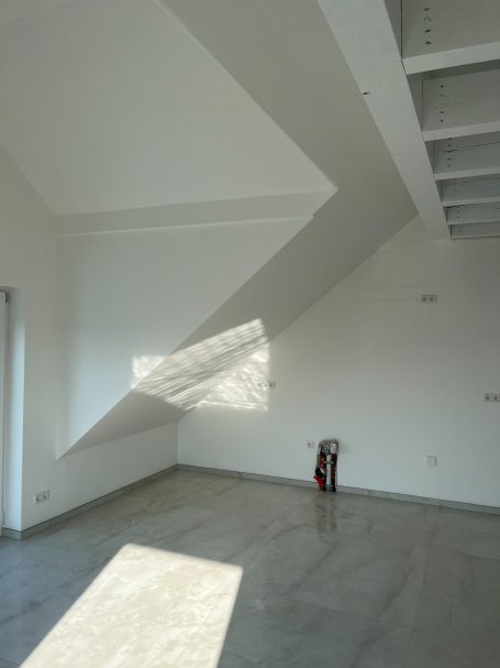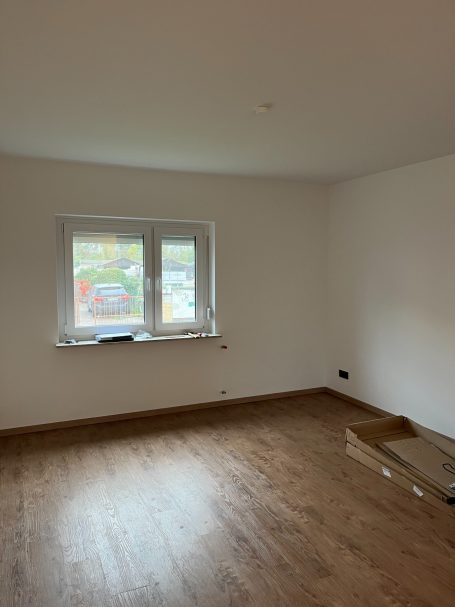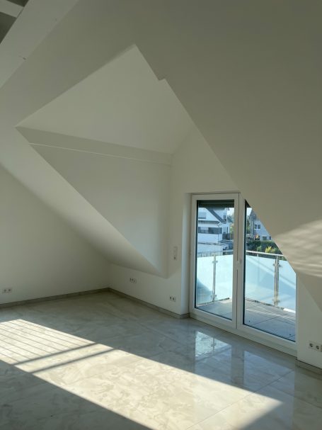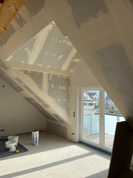 Sanierung nach Wasserschaden im Dachboden: Alle Flächen fachgerecht mit Gipskarton verkleidet und sauber verspachtelt, anschließend mit Malervlies tapeziert und gestrichen. Der edle Vinylboden mit weißen Sockelleisten verleiht den Räumen eine moderne Atmosphäre. Alles aus einer Hand – zuverlässig und sauber umgesetzt.