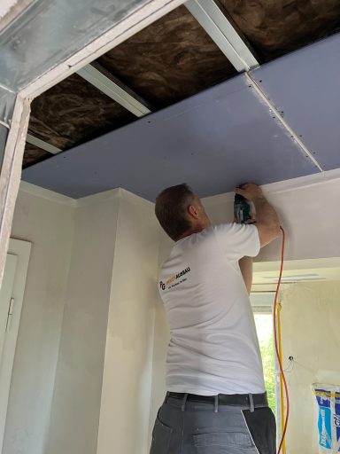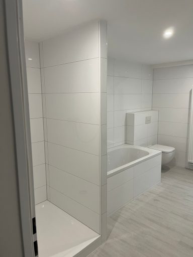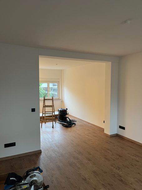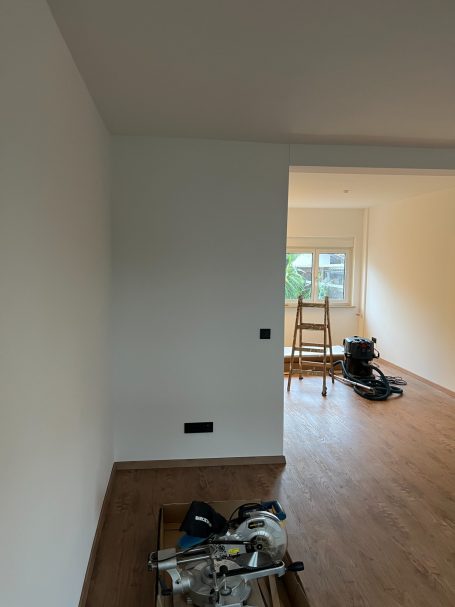 Wohnungssanierung im Bestand mit hochwertigem Innenausbau: Abgehängte Gipskartondecken, Decken und Wände mit Q3-Spachtelung, Malervlies und präzisen Malerarbeiten für eine makellose Oberfläche. Der edle Vinylboden mit weißen Sockelleisten rundet das elegante Gesamtbild ab. Zusätzlich wurde das Badezimmer komplett saniert – alles aus einer Hand - für höchste Qualität und Perfektion.