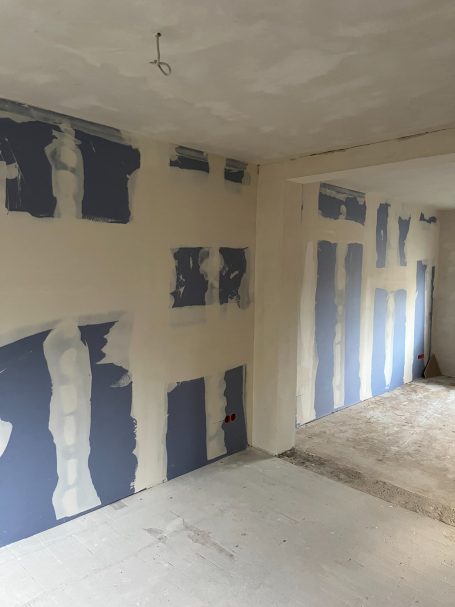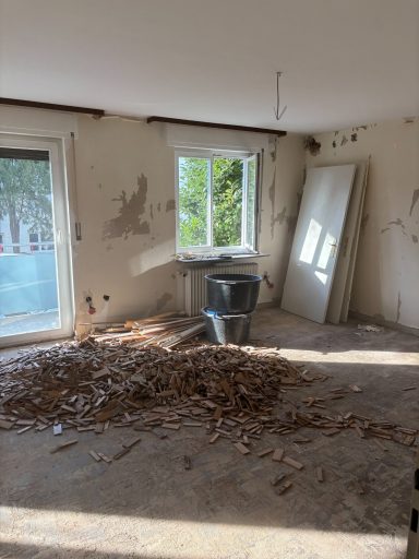 Sanierung einer Altbauwohnung: Wände vollflächig verputzt, verspachtelt und anschließend gestrichen. Bestehende Holzbalken in den Wänden wurden erhalten und bewusst integriert, um den typischen Altbau-Charakter zu bewahren. Ergänzt durch einen edlen Parkettboden entsteht ein stimmiger, natürlicher Altbau-Look. Alles aus einer Hand.