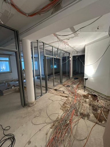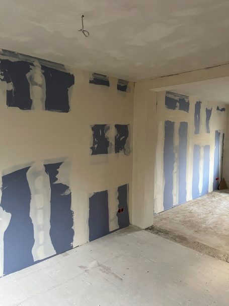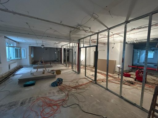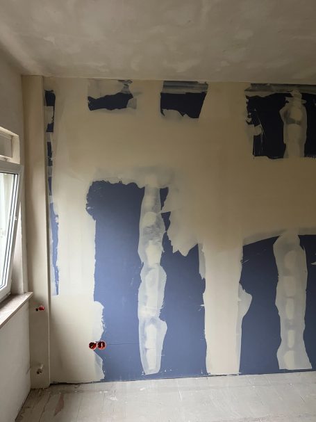 Sanierung von Büroeinheiten nach Wasserschaden: Aufbau von Gipskartonwänden, Decken- und Wandflächen instand gesetzt, gespachtelt und mit Malervlies tapeziert sowie gestrichen. Umsetzung für größere Büroeinheiten – alles aus einer Hand.
