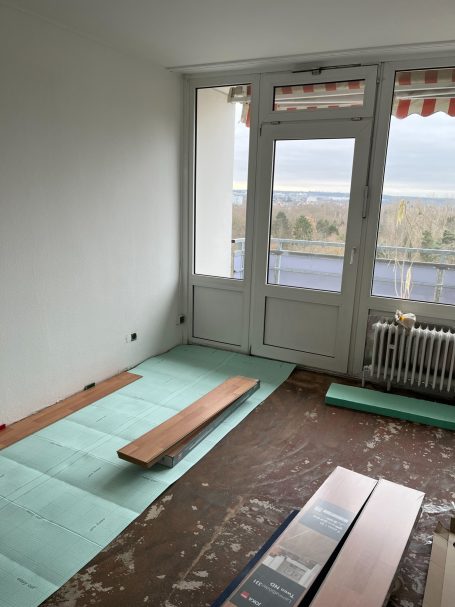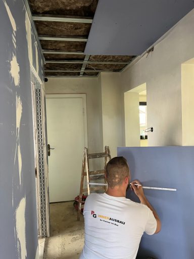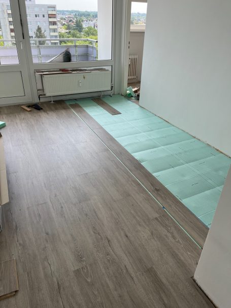 Wohnungssanierung im Bestand mit hochwertigem Innenausbau: Abgehängte Schallschutz Gipskartondecken, Decken und Wände mit Q3-Spachtelung, Malervlies und präzisen Malerarbeiten für eine makellose Oberfläche. Der edle Vinylboden mit Sockelleisten in Bodenfarbe rundet das elegante Gesamtbild ab. Alles aus einer Hand - für höchste Qualität und Perfektion.