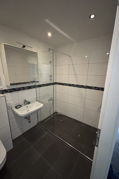 Altersgerechte Badsanierung im Bestand mit barrierefreier Dusche: Die bestehende Badewanne wurde durch eine moderne, begehbare Dusche ersetzt – funktional, stilvoll und sicher. Hochwertige Fliesenarbeiten und klare Linien sorgen für ein modernes Erscheinungsbild. Alles aus einer Hand – für Qualität und Zuverlässigkeit bis ins Detail.