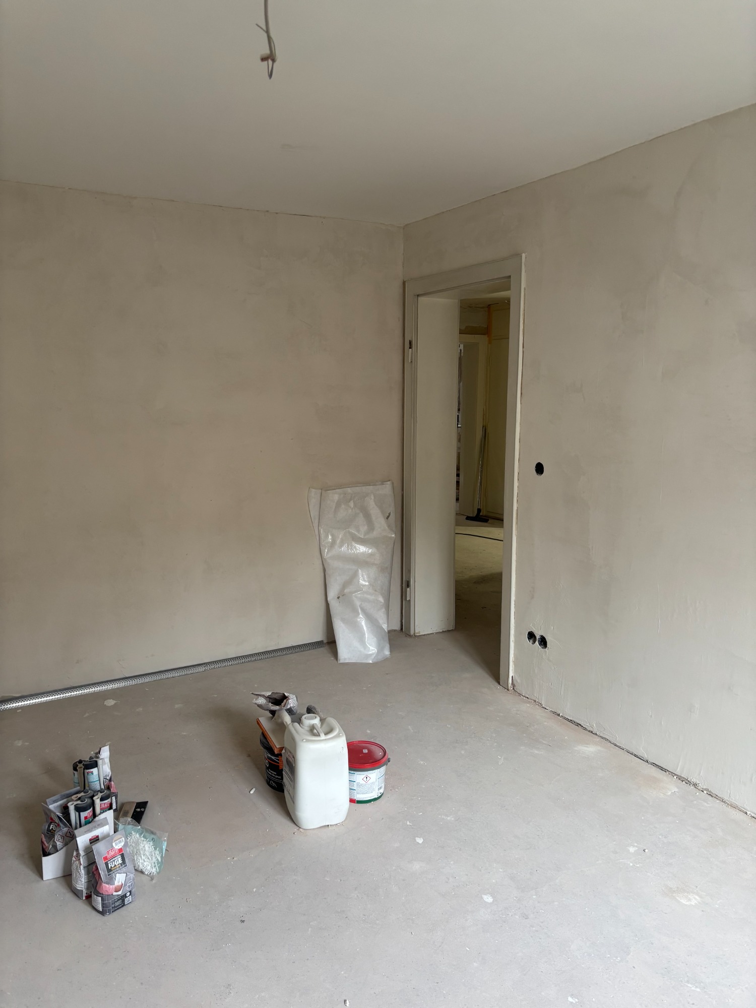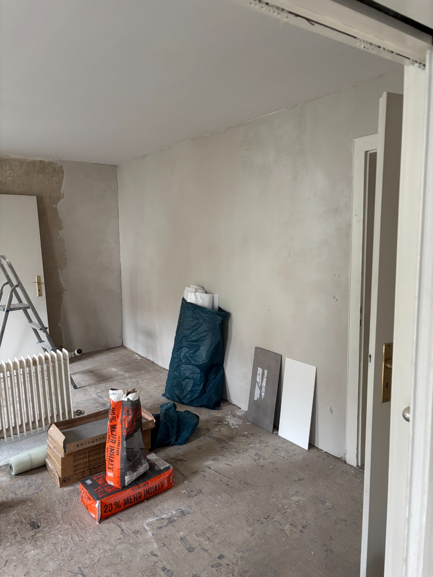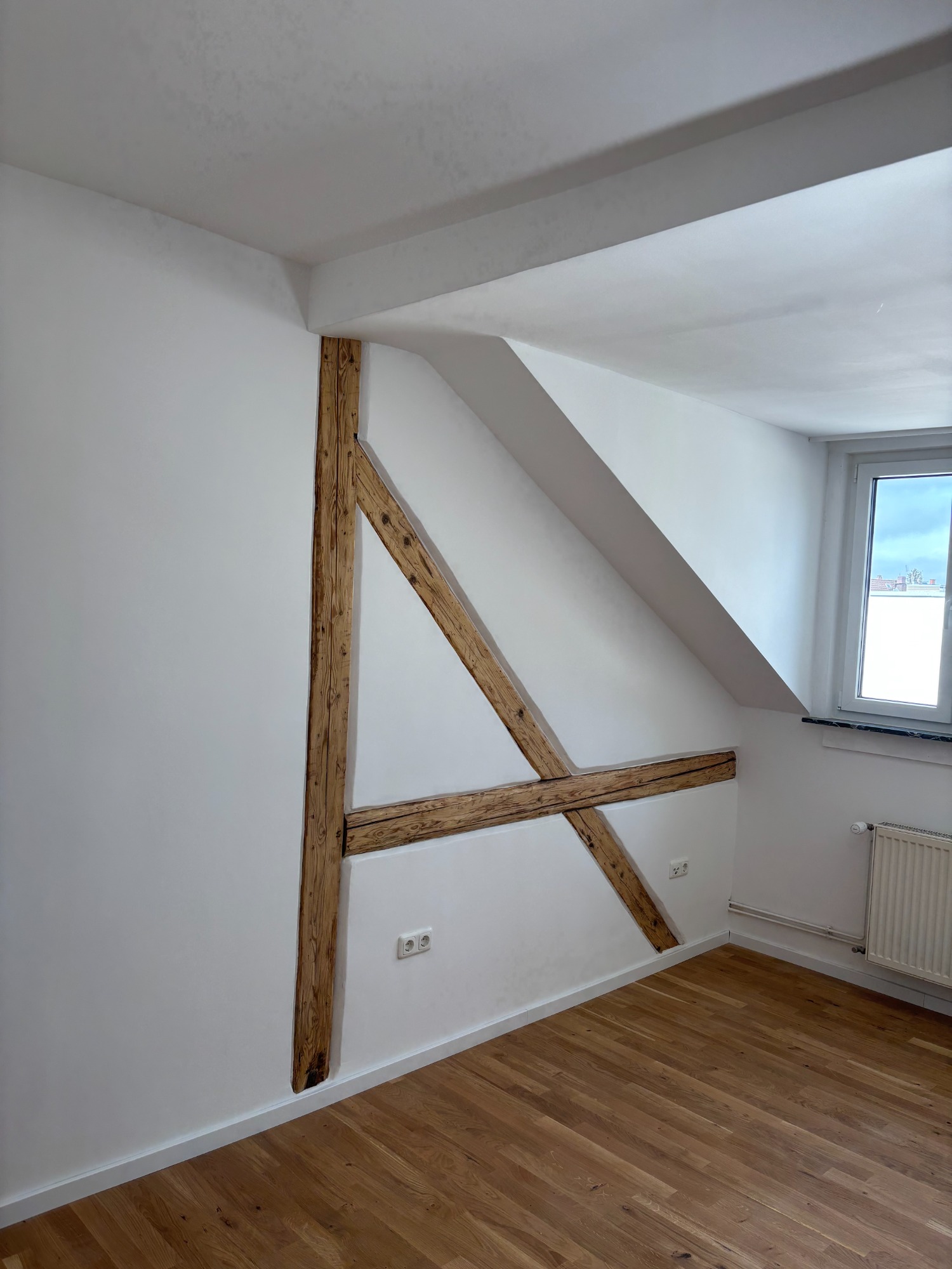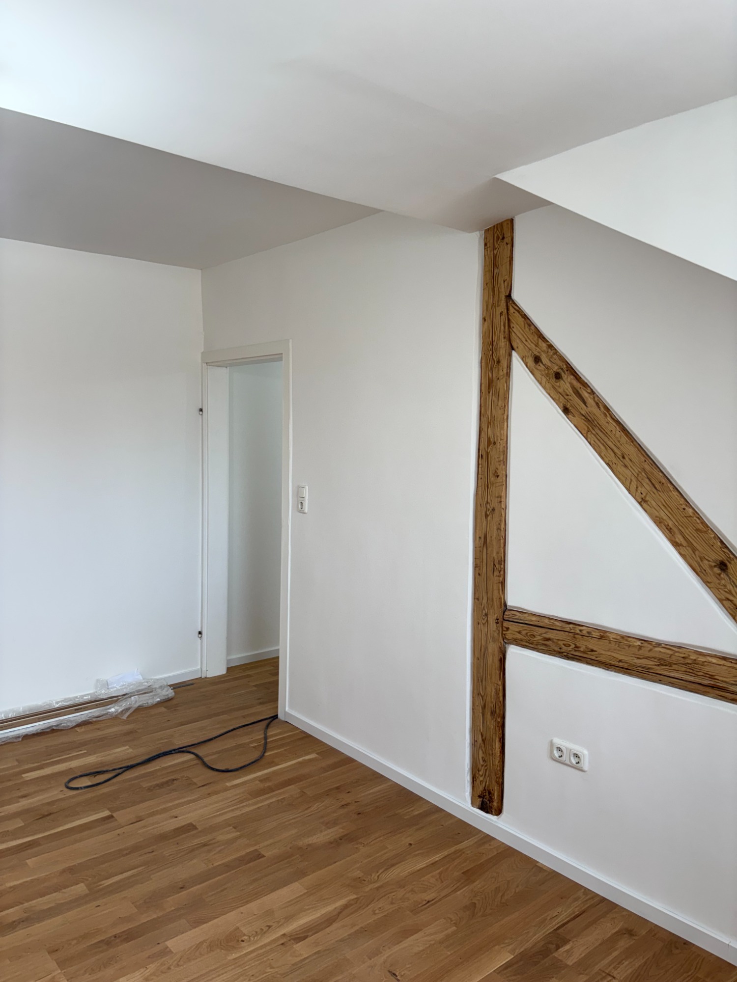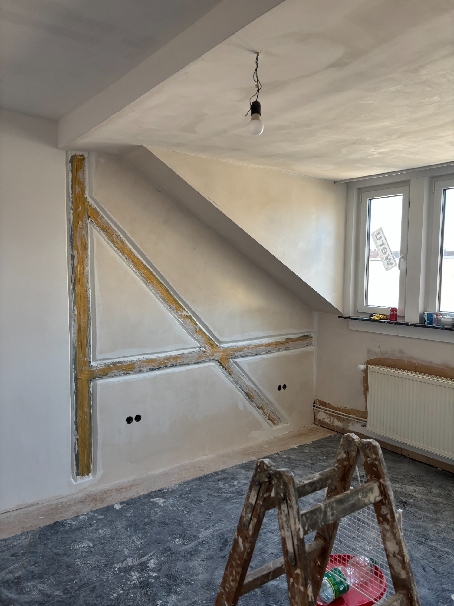 Sanierung einer Altbauwohnung: Wände vollflächig verputzt, verspachtelt und anschließend gestrichen. Bestehende Holzbalken in den Wänden wurden erhalten und bewusst integriert, um den typischen Altbau-Charakter zu bewahren. Ergänzt durch einen edlen Parkettboden entsteht ein stimmiger, natürlicher Altbau-Look. Alles aus einer Hand.