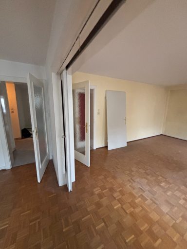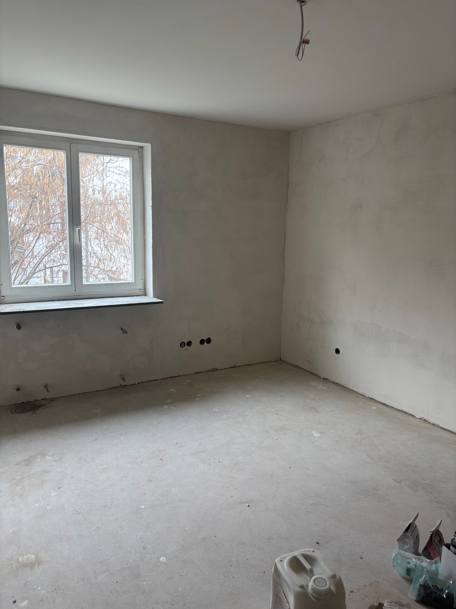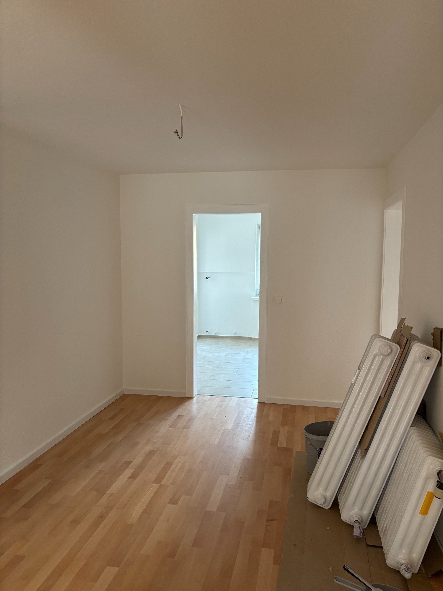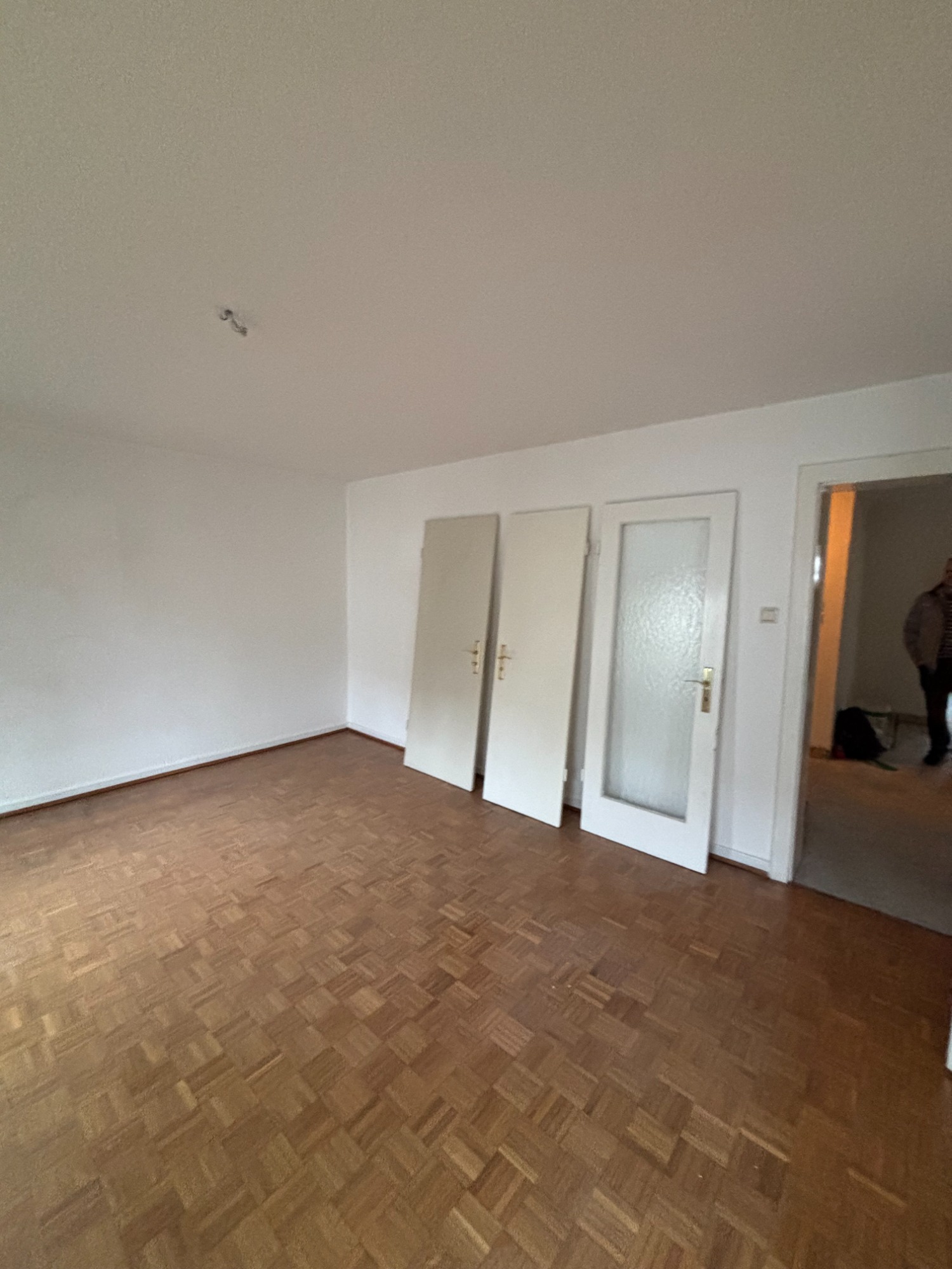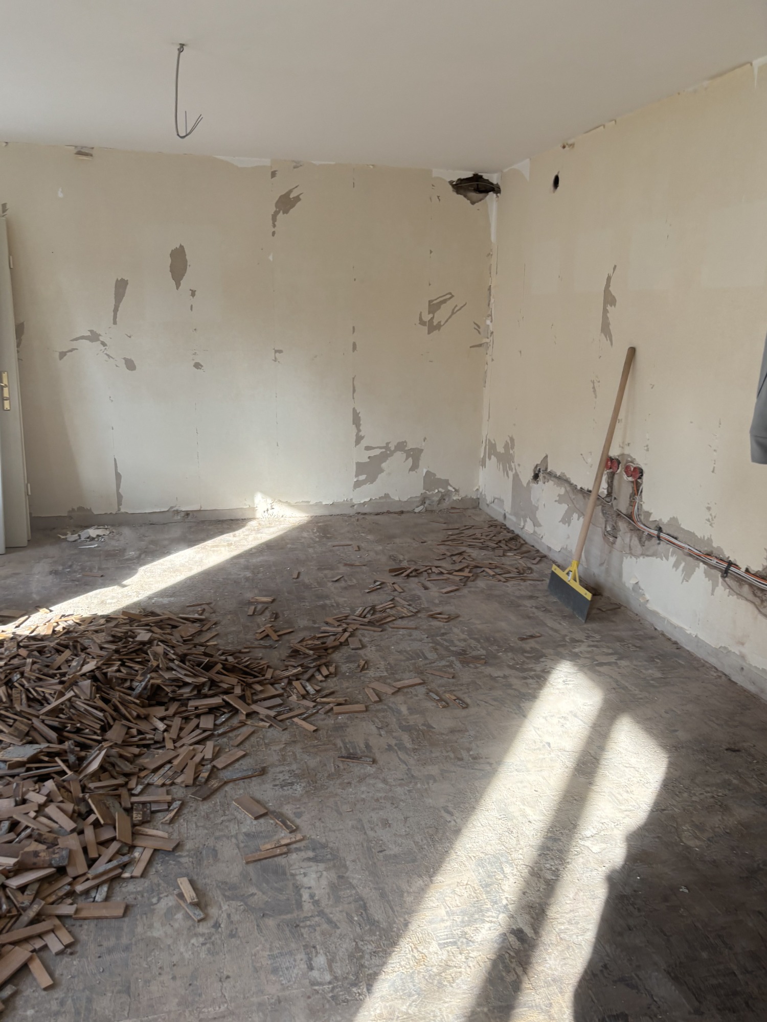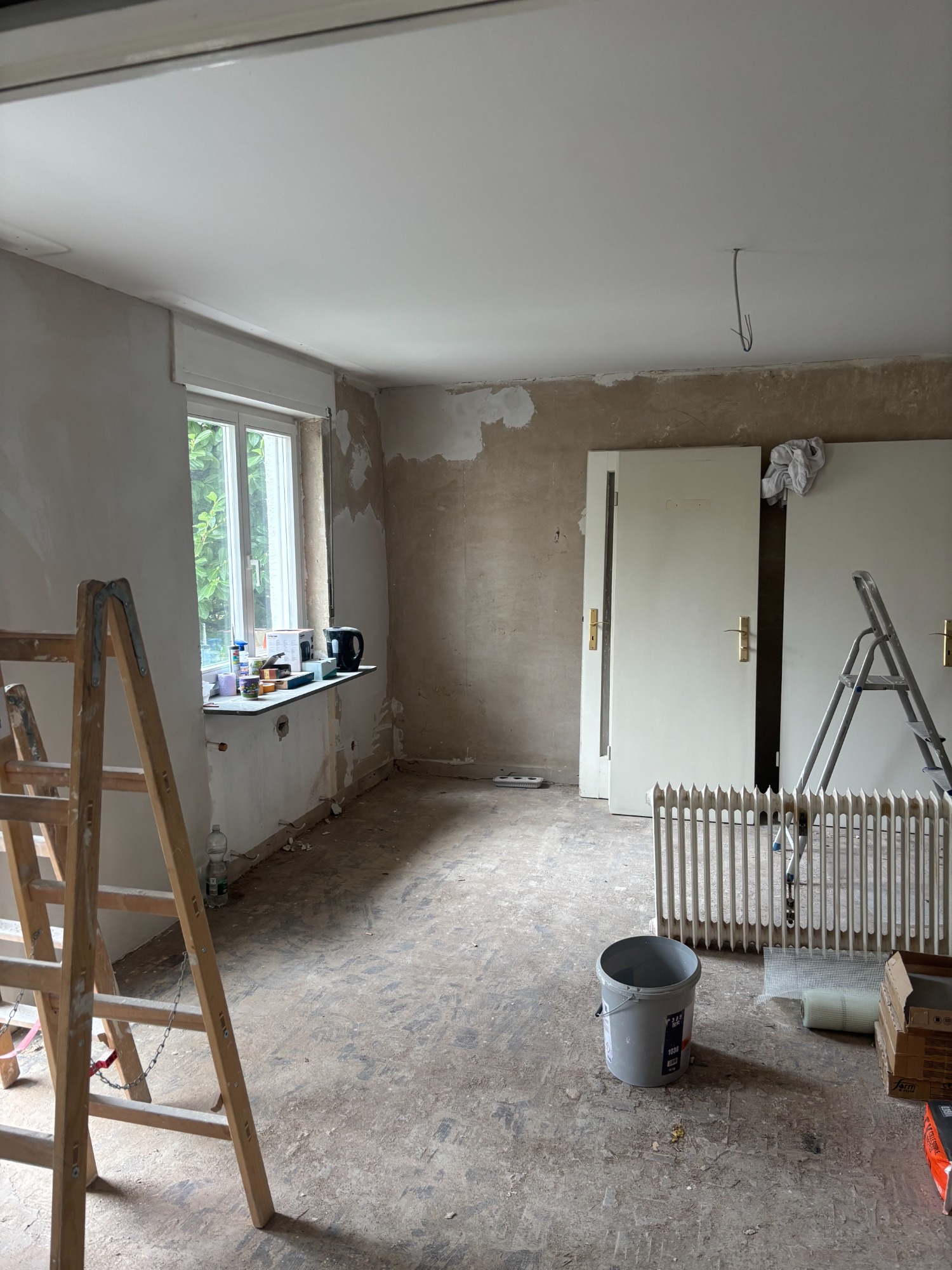 Sanierung einer Altbauwohnung: Wände vollflächig verputzt, verspachtelt und anschließend gestrichen. Bestehende Holzbalken in den Wänden wurden erhalten und bewusst integriert, um den typischen Altbau-Charakter zu bewahren. Ergänzt durch einen edlen Parkettboden entsteht ein stimmiger, natürlicher Altbau-Look. Alles aus einer Hand.