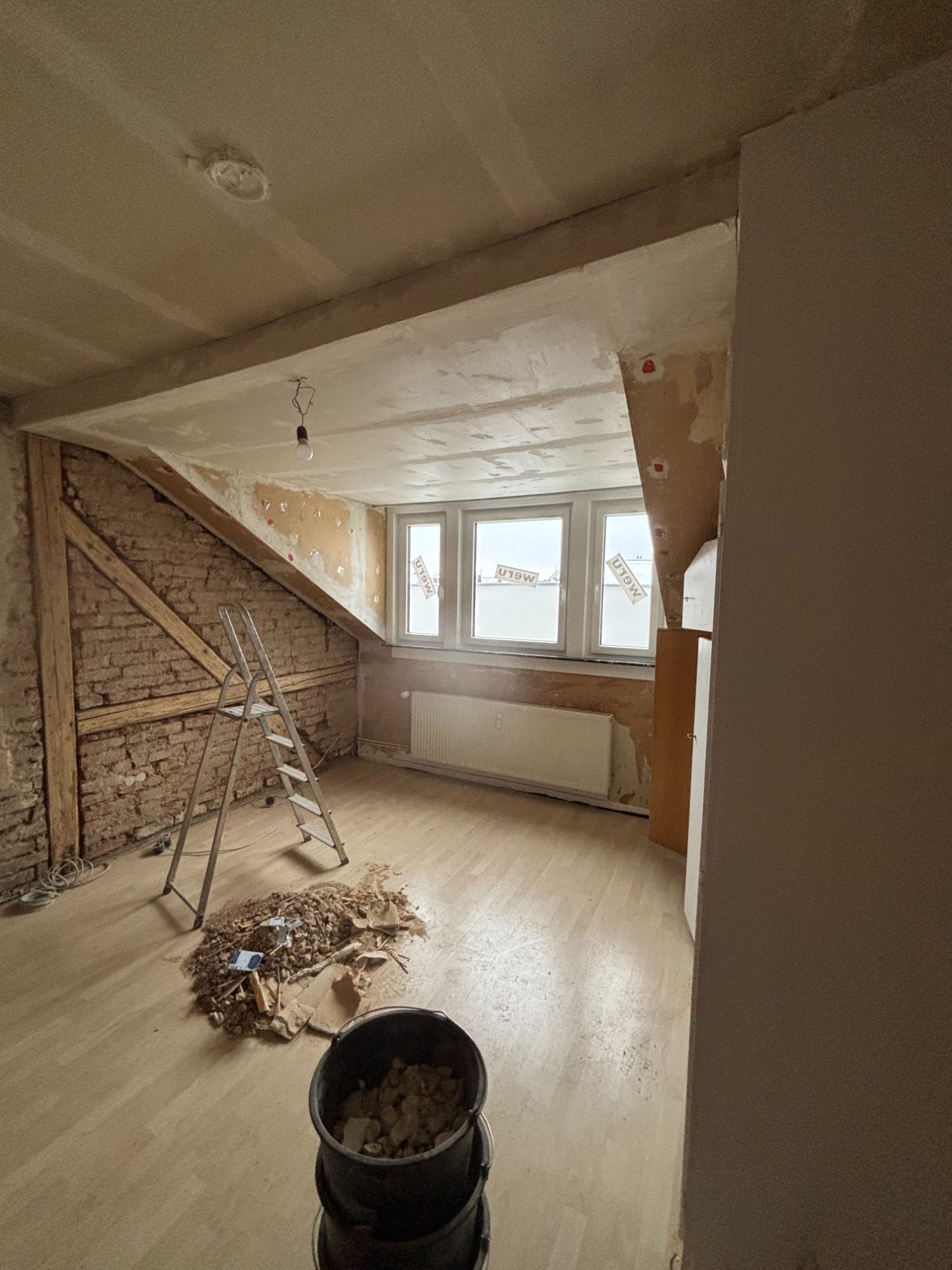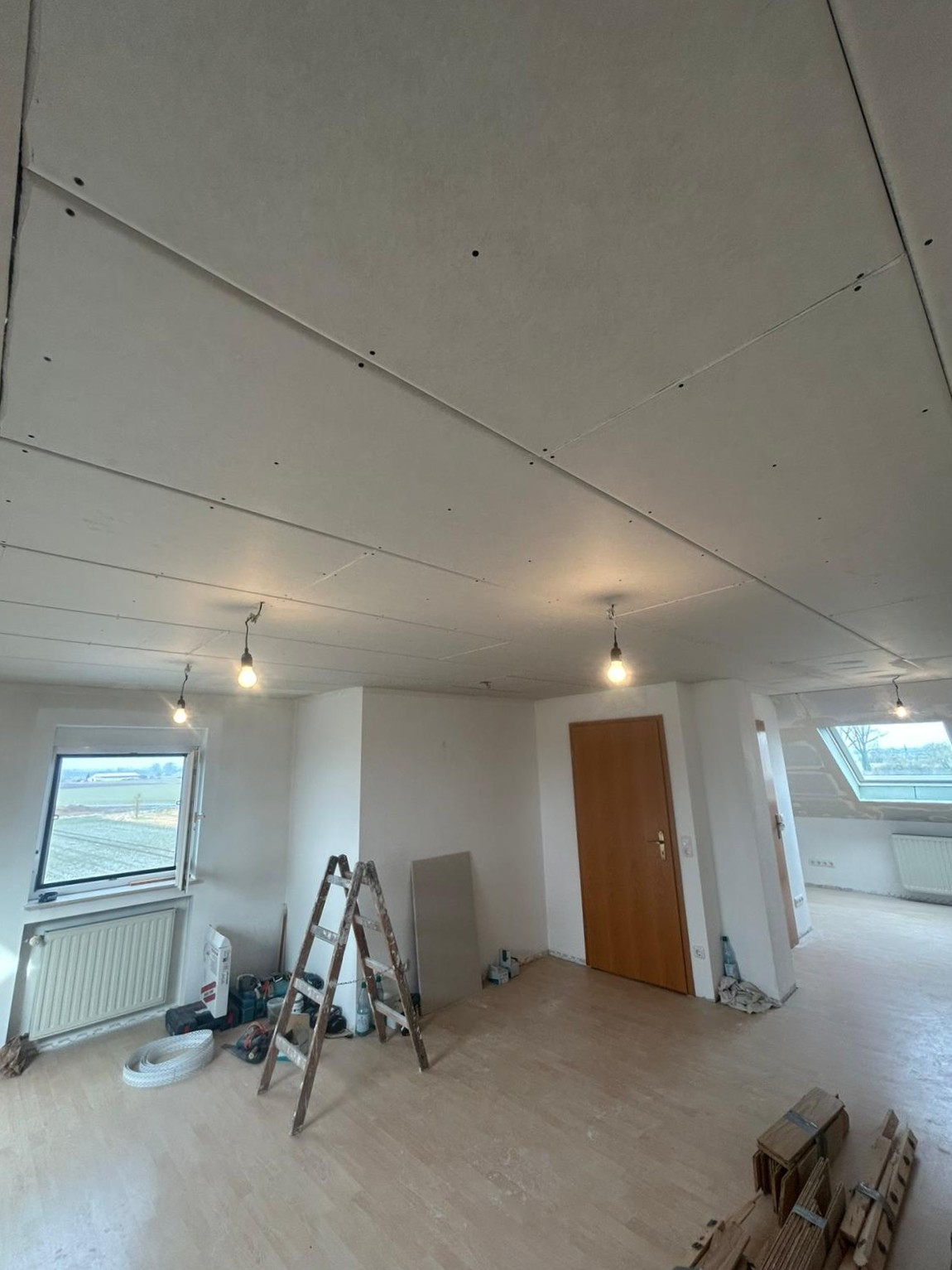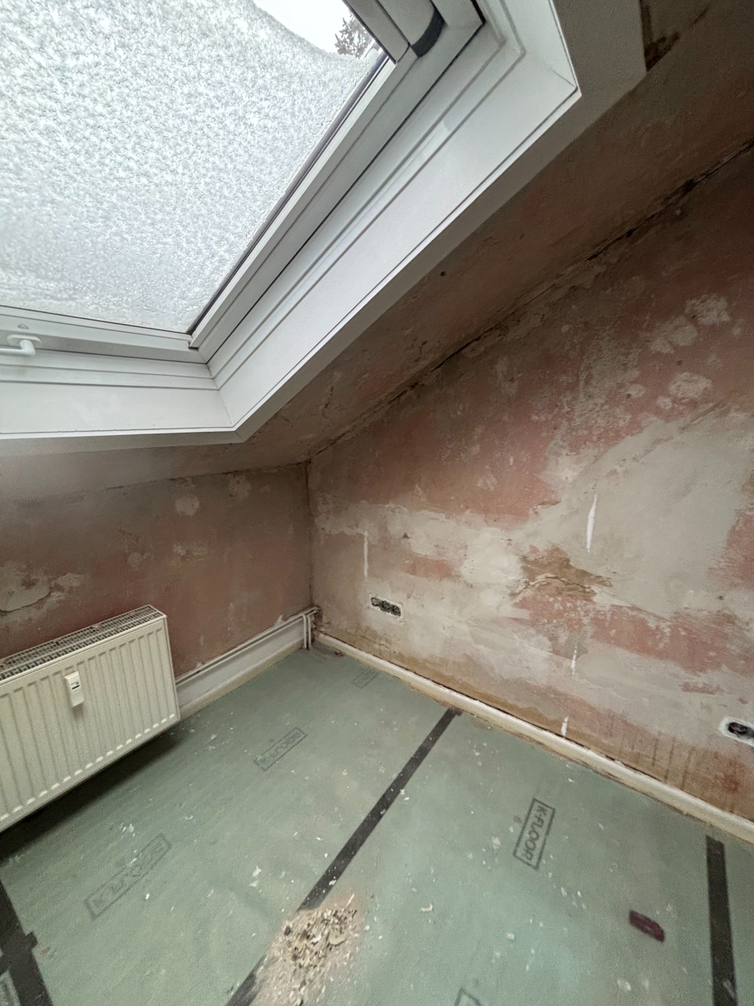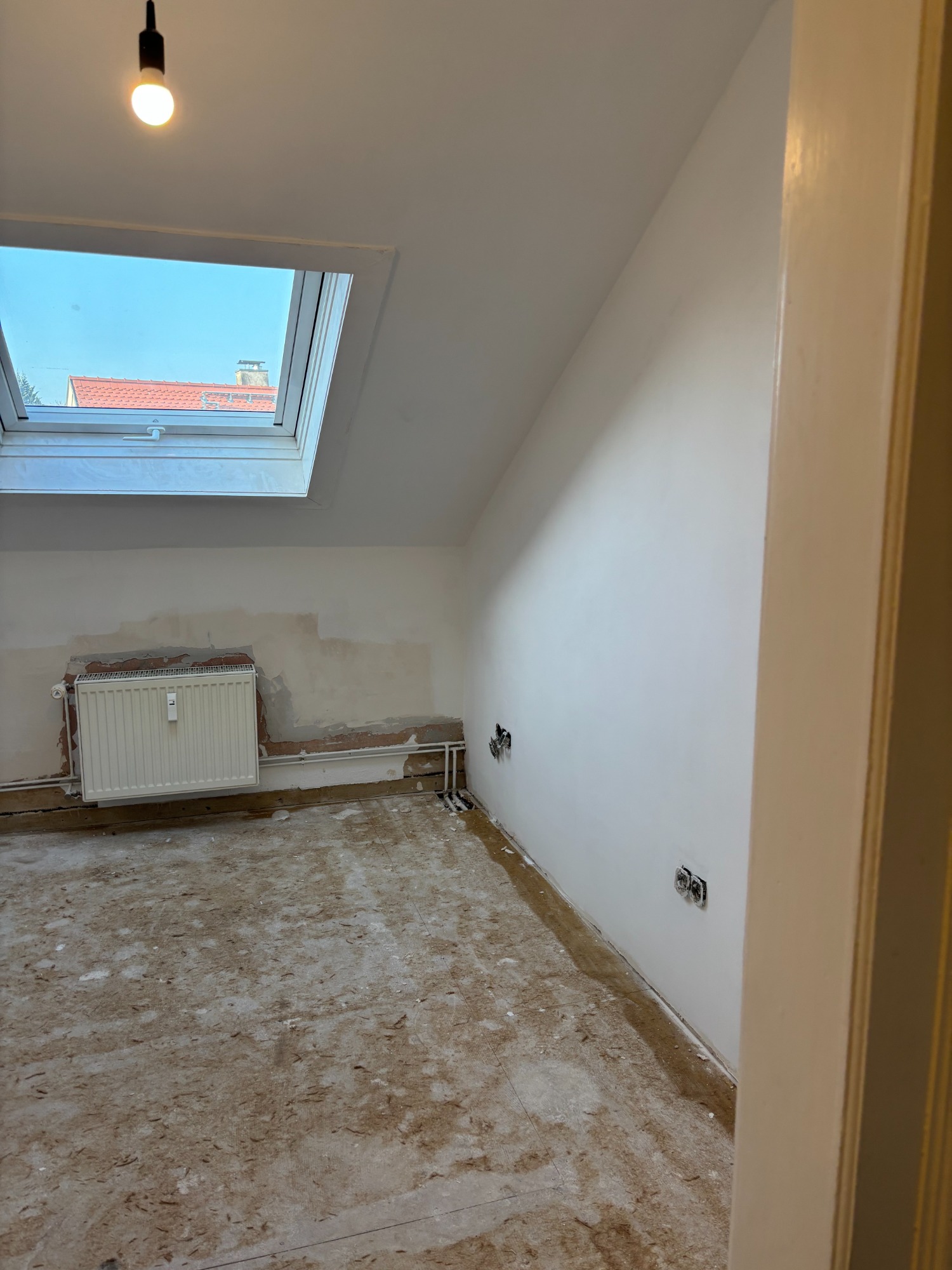 Sanierung nach Wasserschaden im Dachboden: Alle Flächen fachgerecht mit Gipskarton verkleidet und sauber verspachtelt, anschließend mit Malervlies tapeziert und gestrichen. Der edle Vinylboden mit weißen Sockelleisten verleiht den Räumen eine moderne Atmosphäre. Alles aus einer Hand – zuverlässig und sauber umgesetzt.