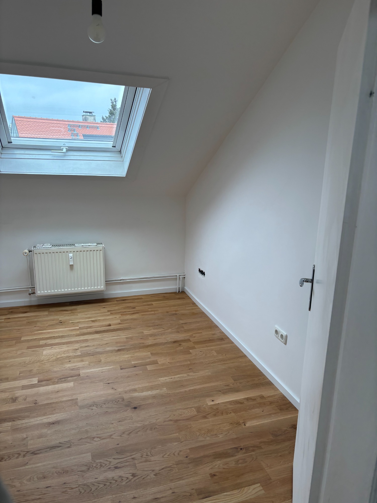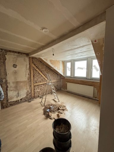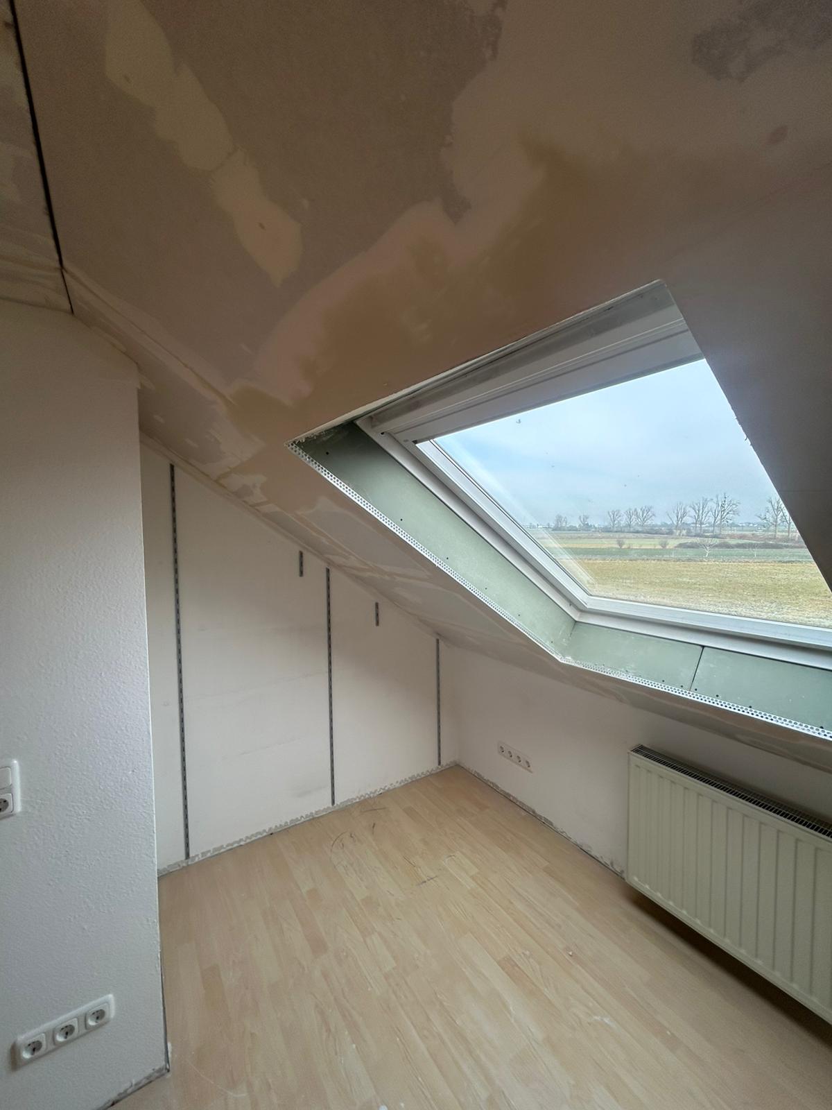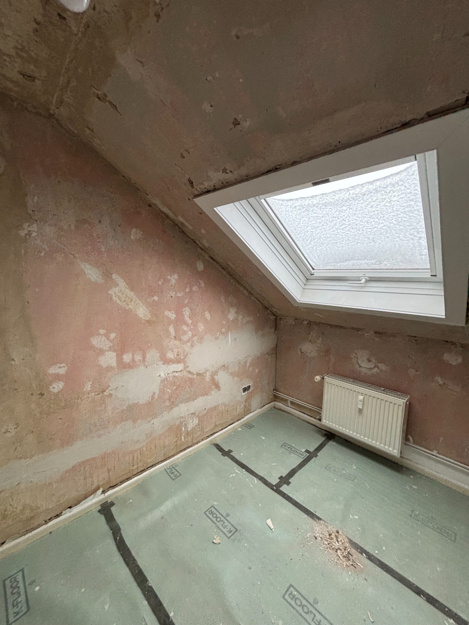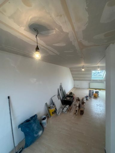 Sanierung nach Wasserschaden im Dachboden: Alle Flächen fachgerecht mit Gipskarton verkleidet und sauber verspachtelt, anschließend mit Malervlies tapeziert und gestrichen. Der edle Vinylboden mit weißen Sockelleisten verleiht den Räumen eine moderne Atmosphäre. Alles aus einer Hand – zuverlässig und sauber umgesetzt.