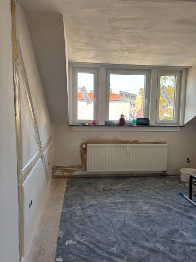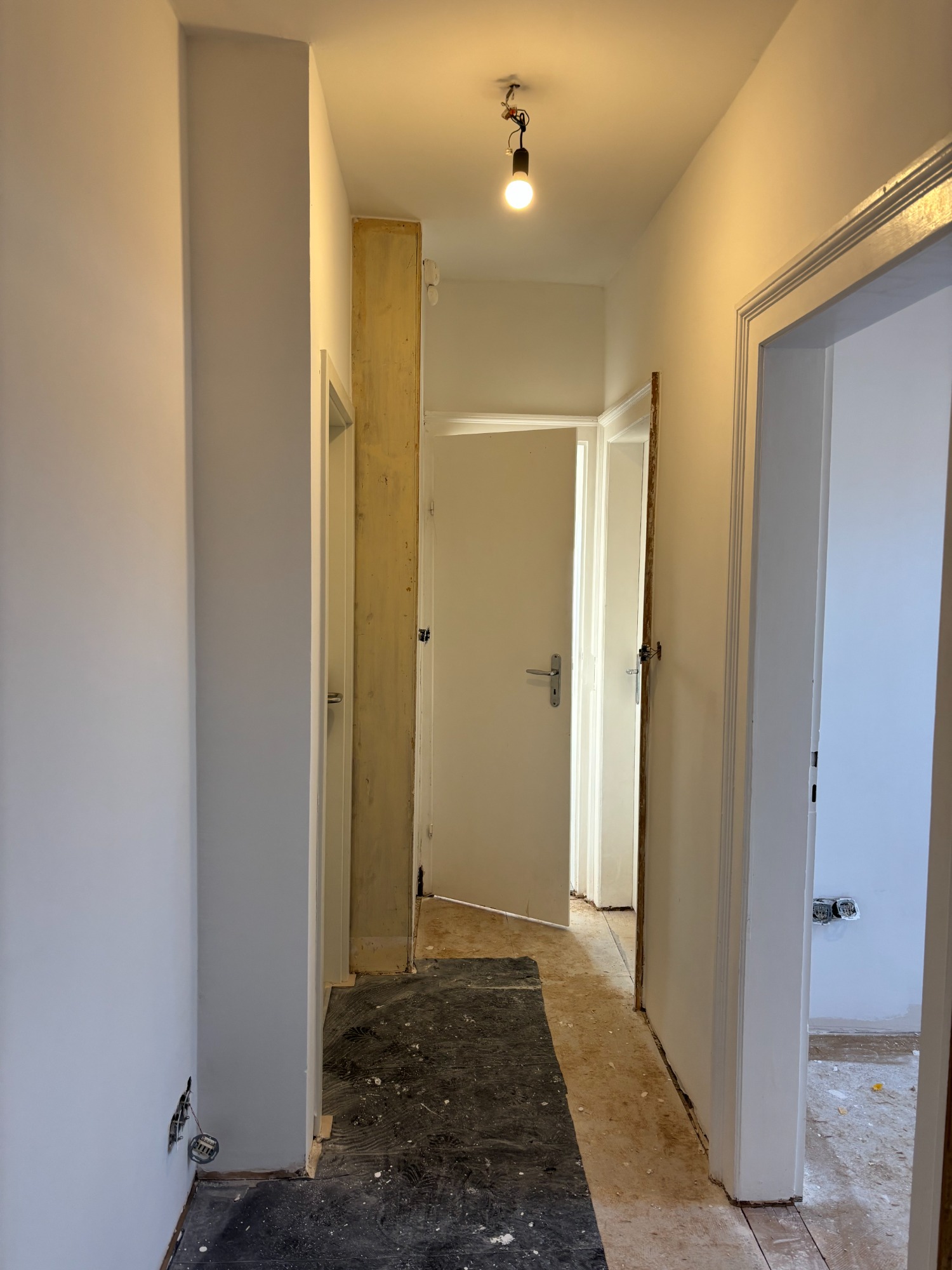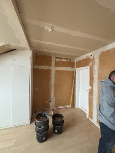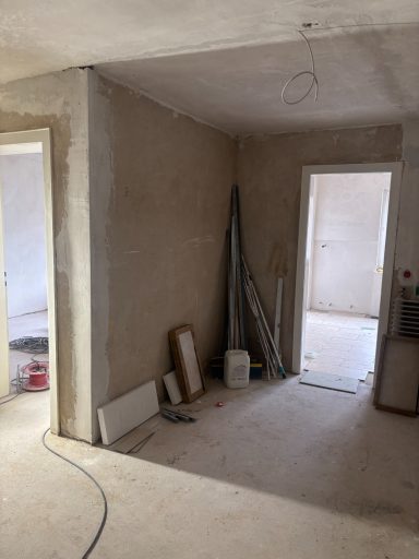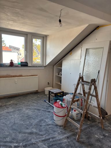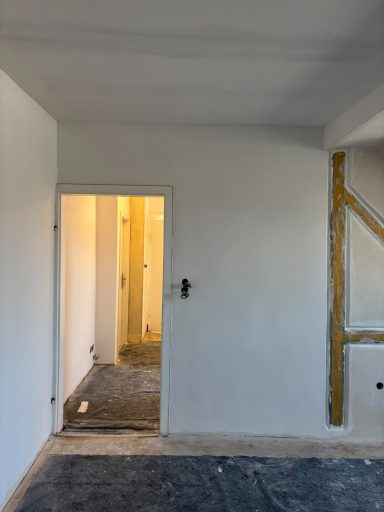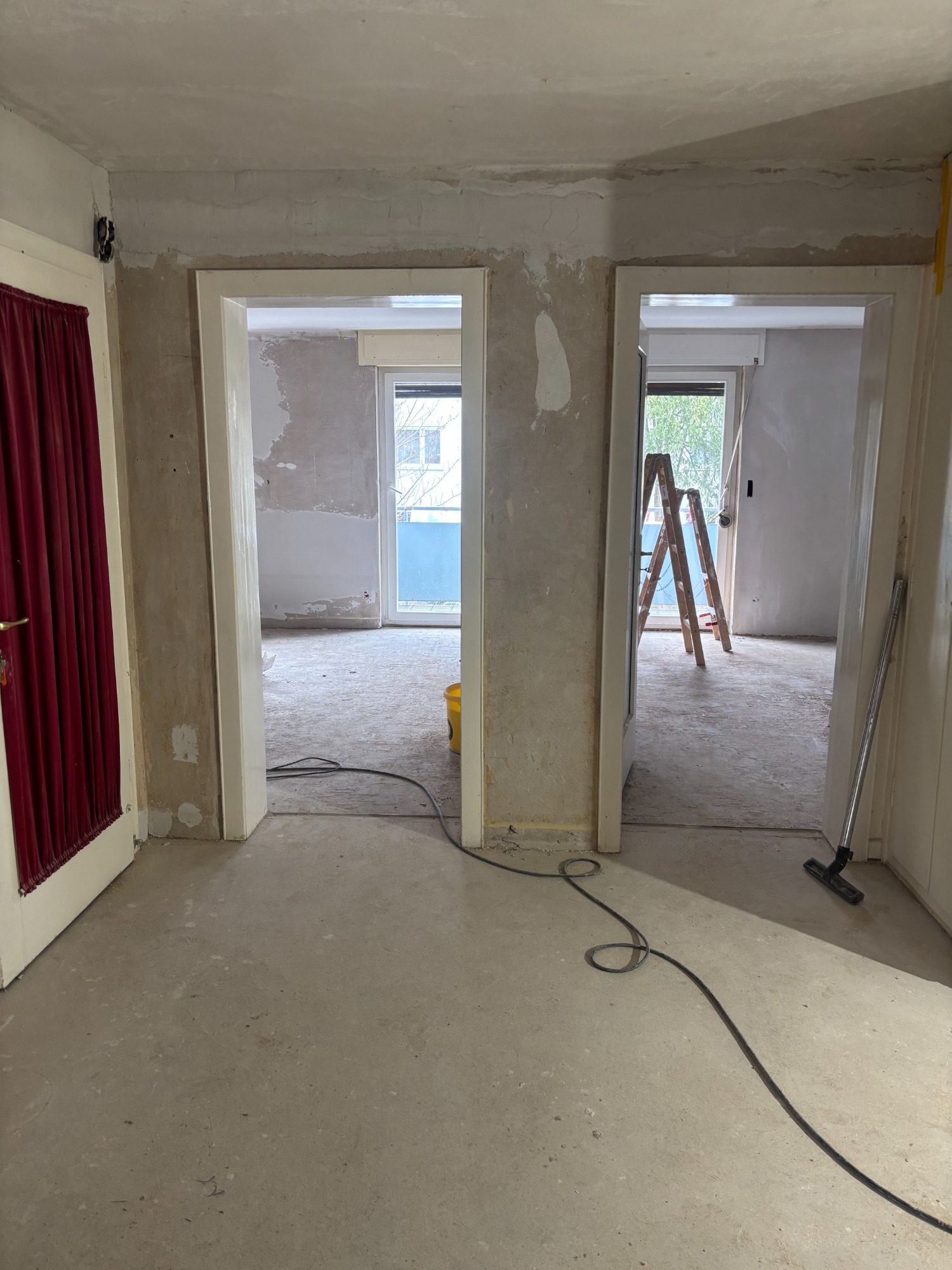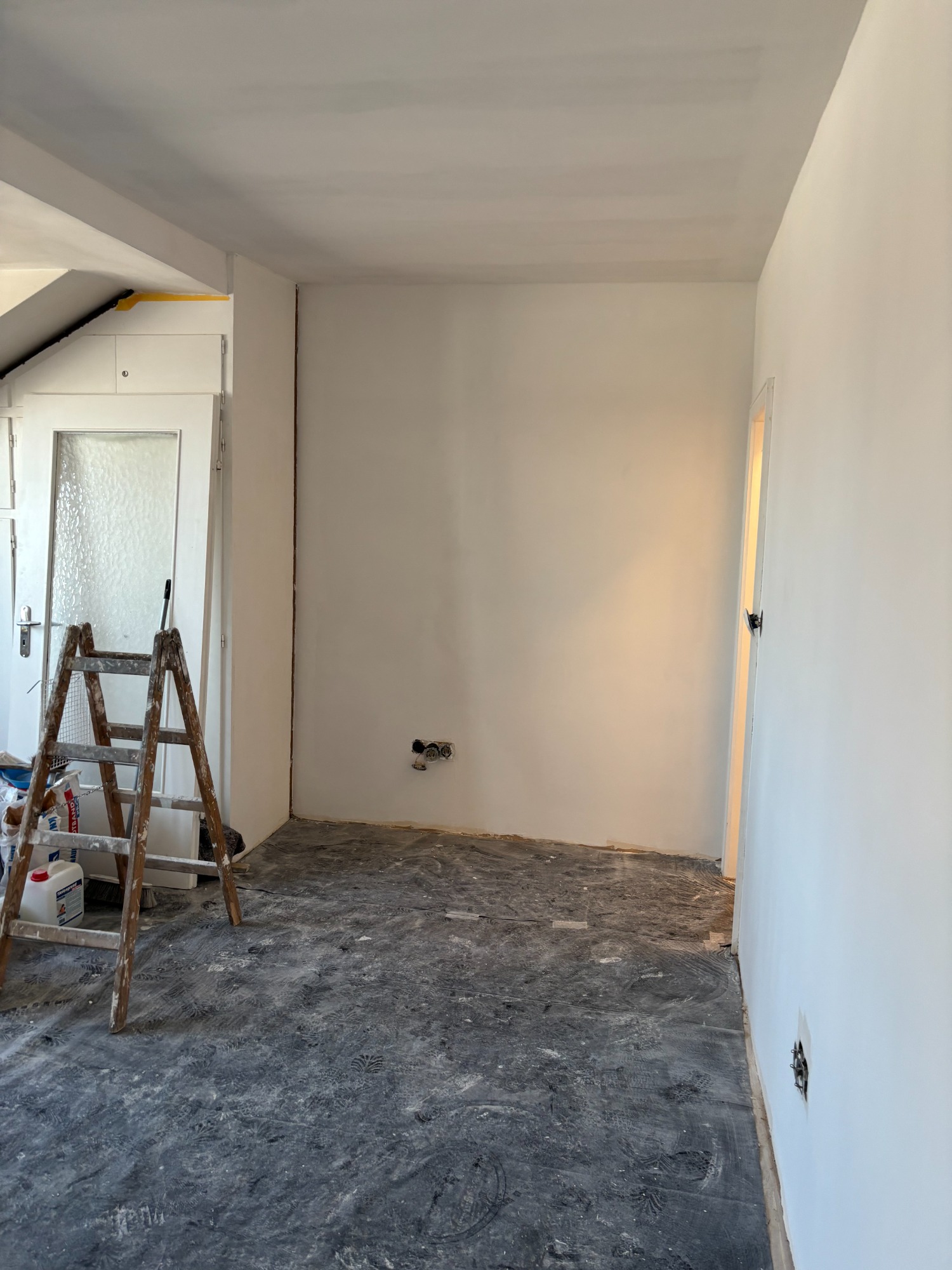 Umnutzung eines ehemaligen Lagerraums zu einer hochwertigen Wohnung: Abgehängte Gipskartondecken, Decken und Wände mit Q3-Spachtelung, Malervlies und präzisen Malerarbeiten für eine makellose Oberfläche. Der edle Vinylboden mit weißen Sockelleisten verleiht den Räumen eine warme, moderne Atmosphäre. Alles aus einer Hand – für höchste Qualität und Perfektion.