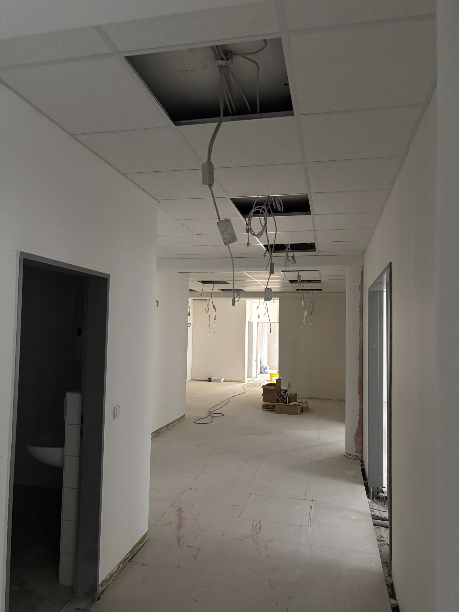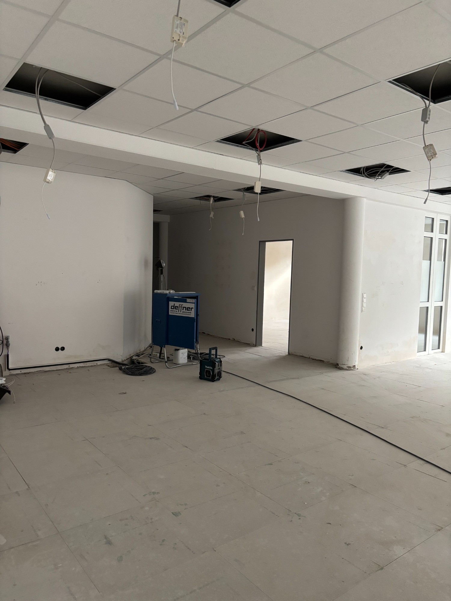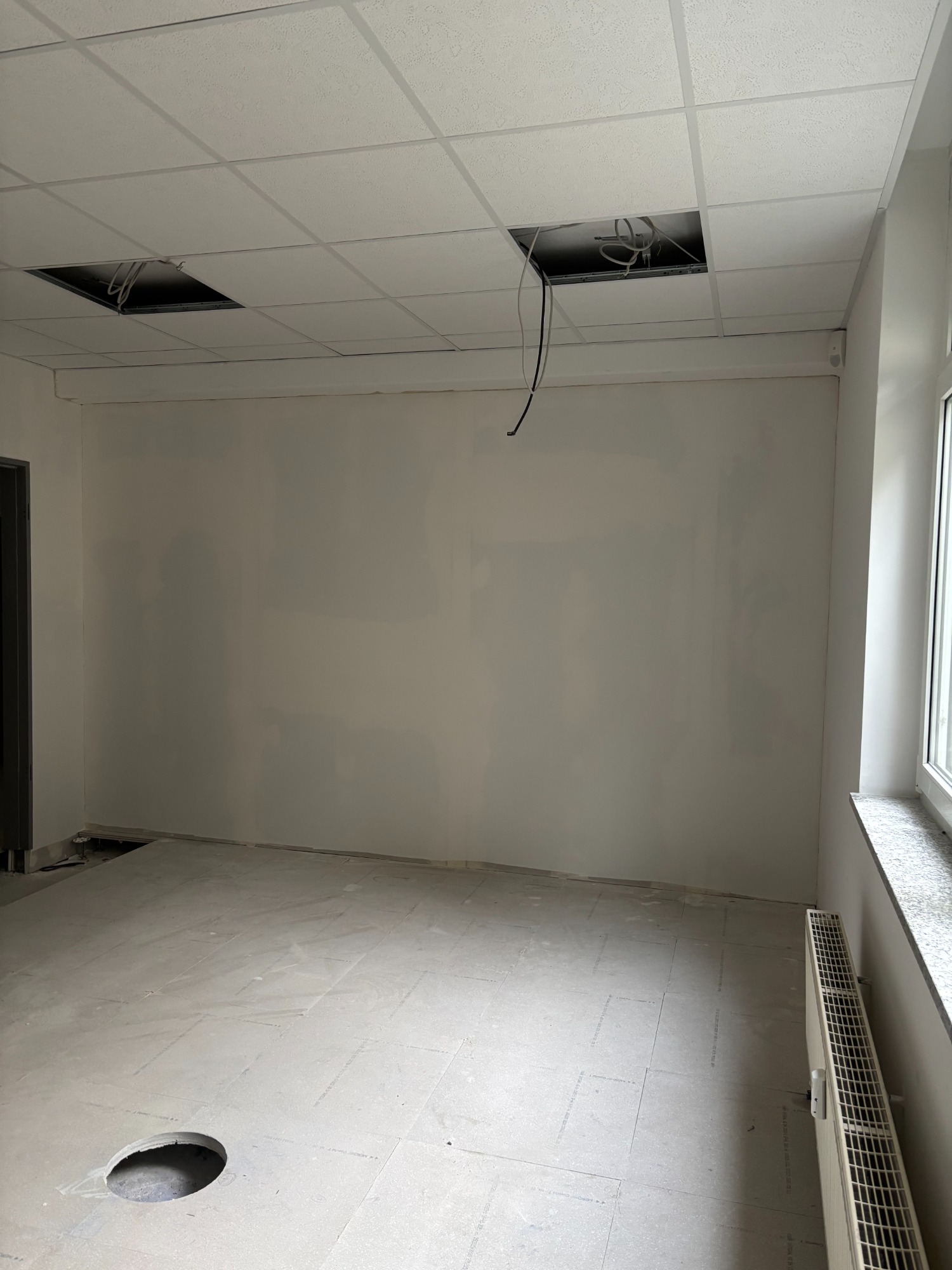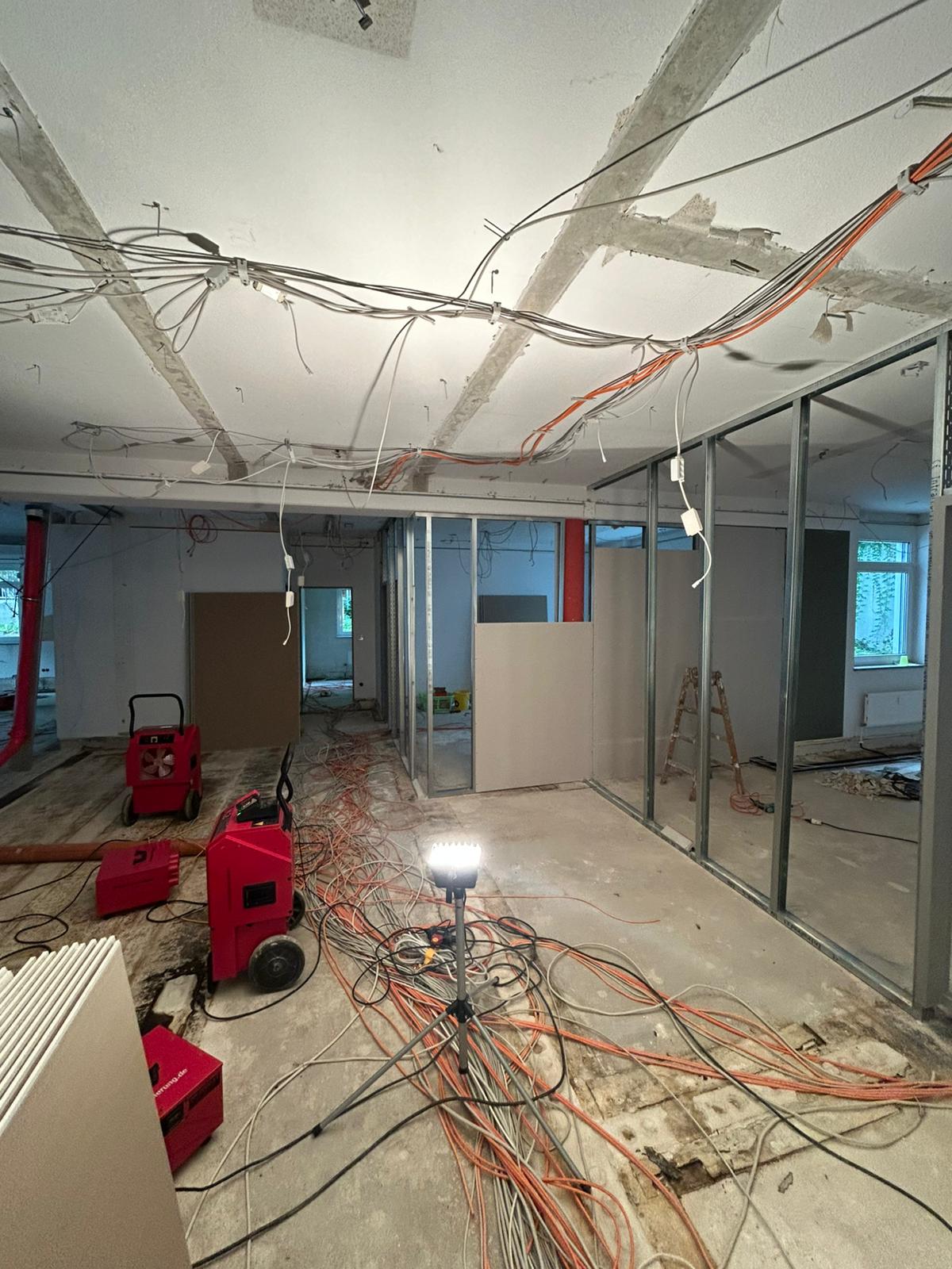 Sanierung von Büroeinheiten nach Wasserschaden: Aufbau von Gipskartonwänden, Decken- und Wandflächen instand gesetzt, gespachtelt und mit Malervlies tapeziert sowie gestrichen. Umsetzung für größere Büroeinheiten – alles aus einer Hand.