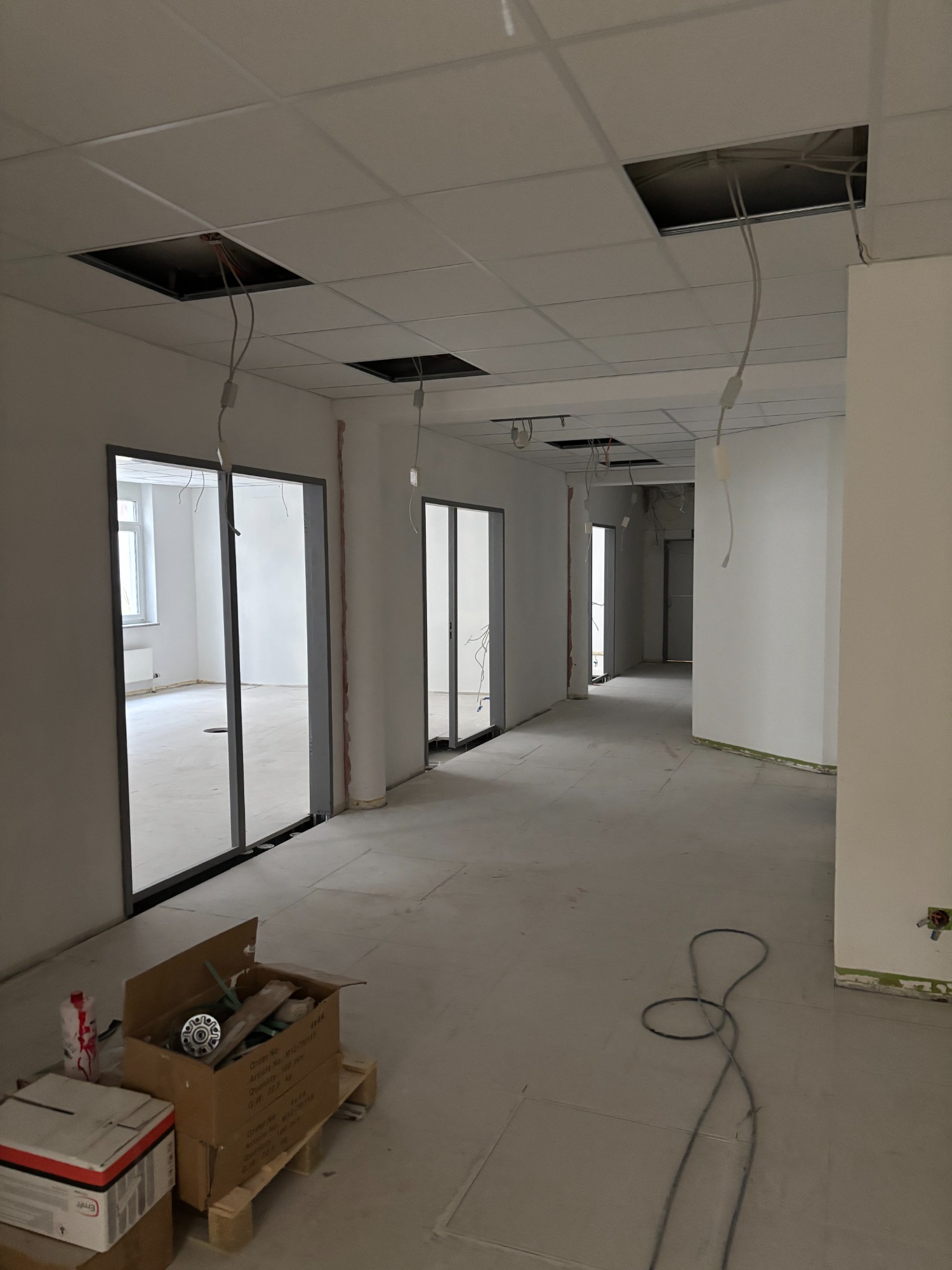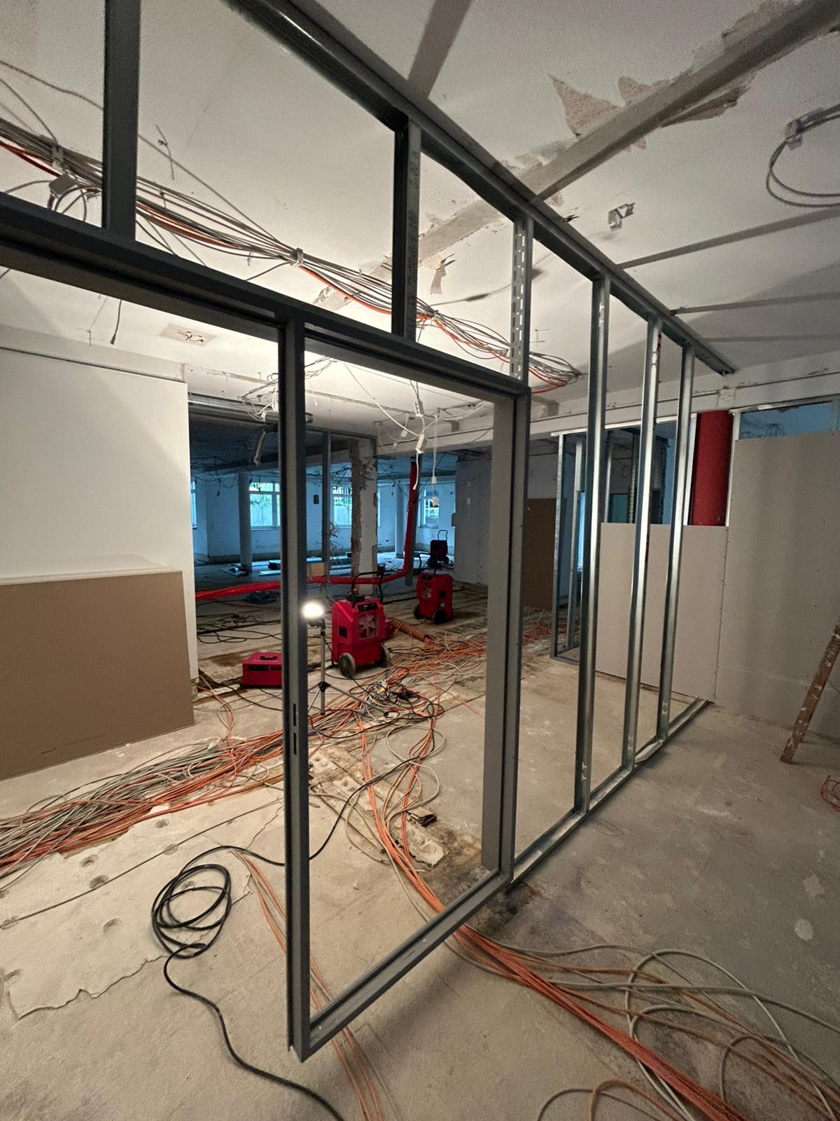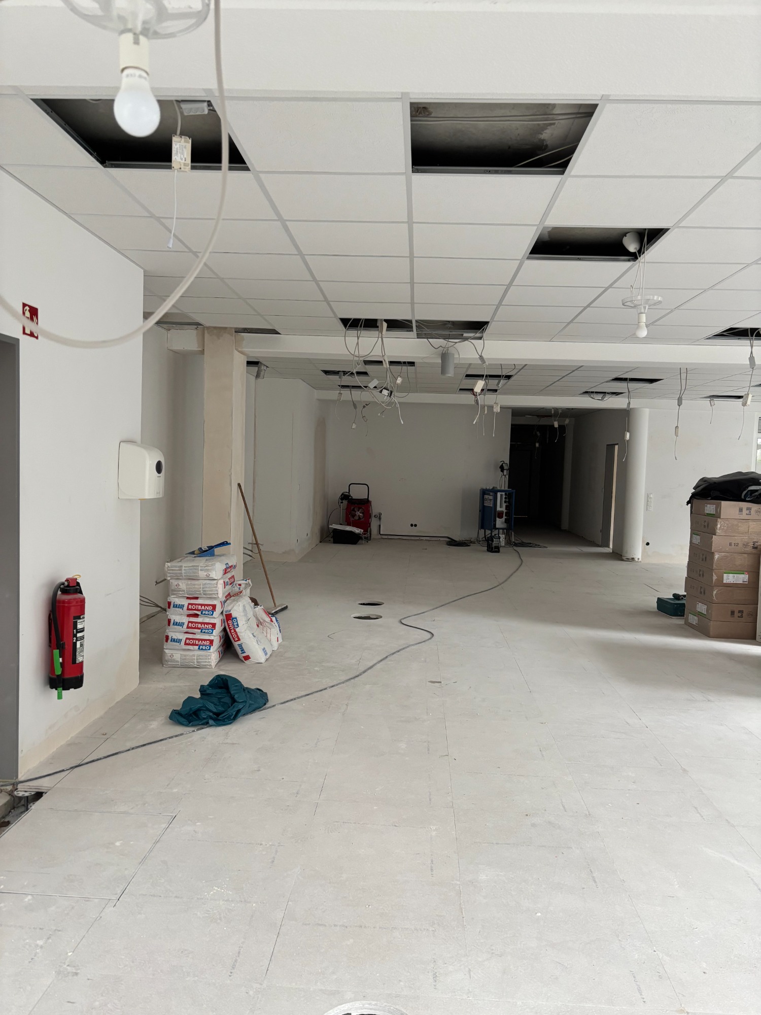 Sanierung von Büroeinheiten nach Wasserschaden: Aufbau von Gipskartonwänden, Decken- und Wandflächen instand gesetzt, gespachtelt und mit Malervlies tapeziert sowie gestrichen. Umsetzung für größere Büroeinheiten – alles aus einer Hand.