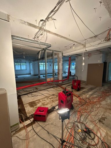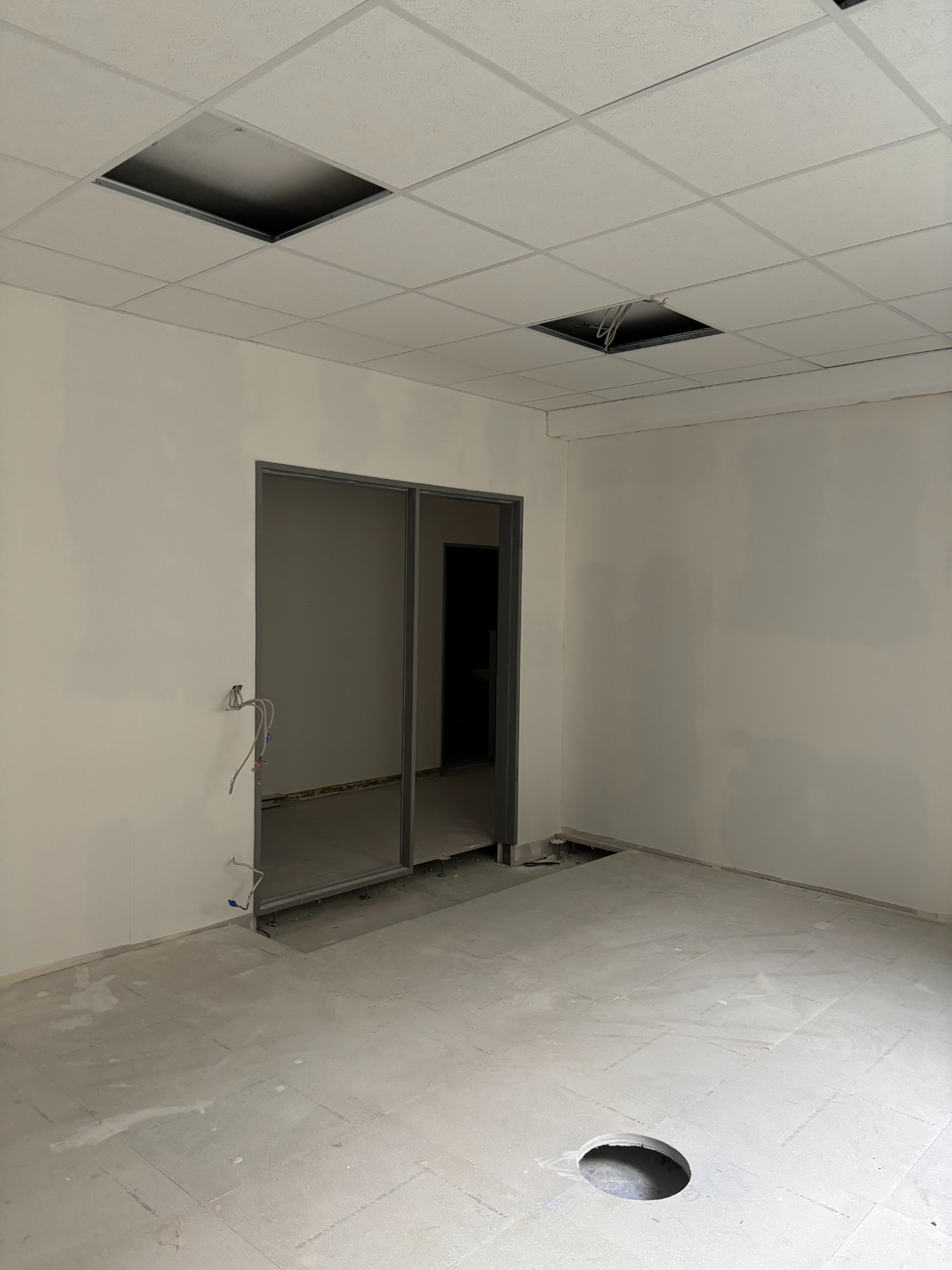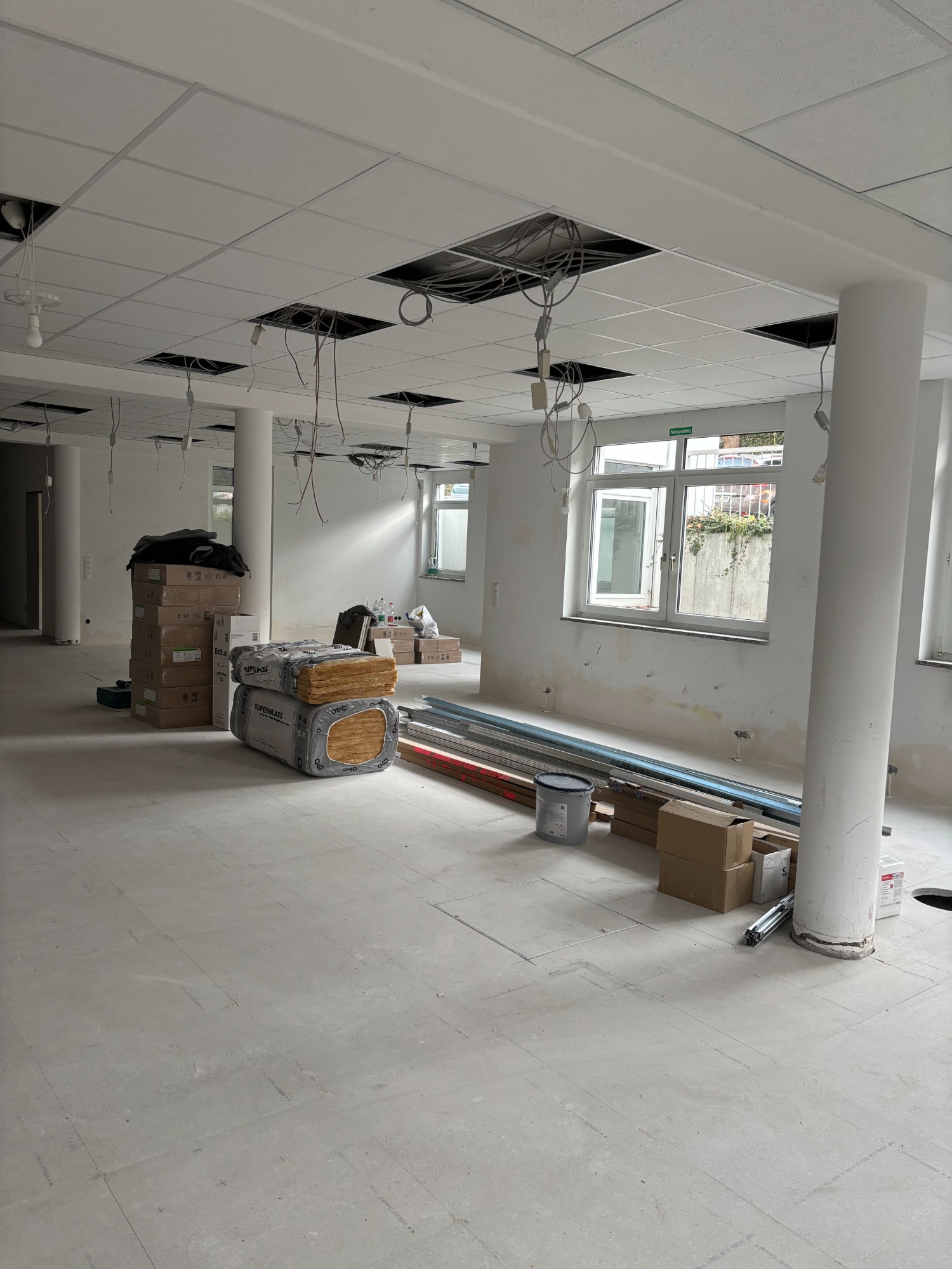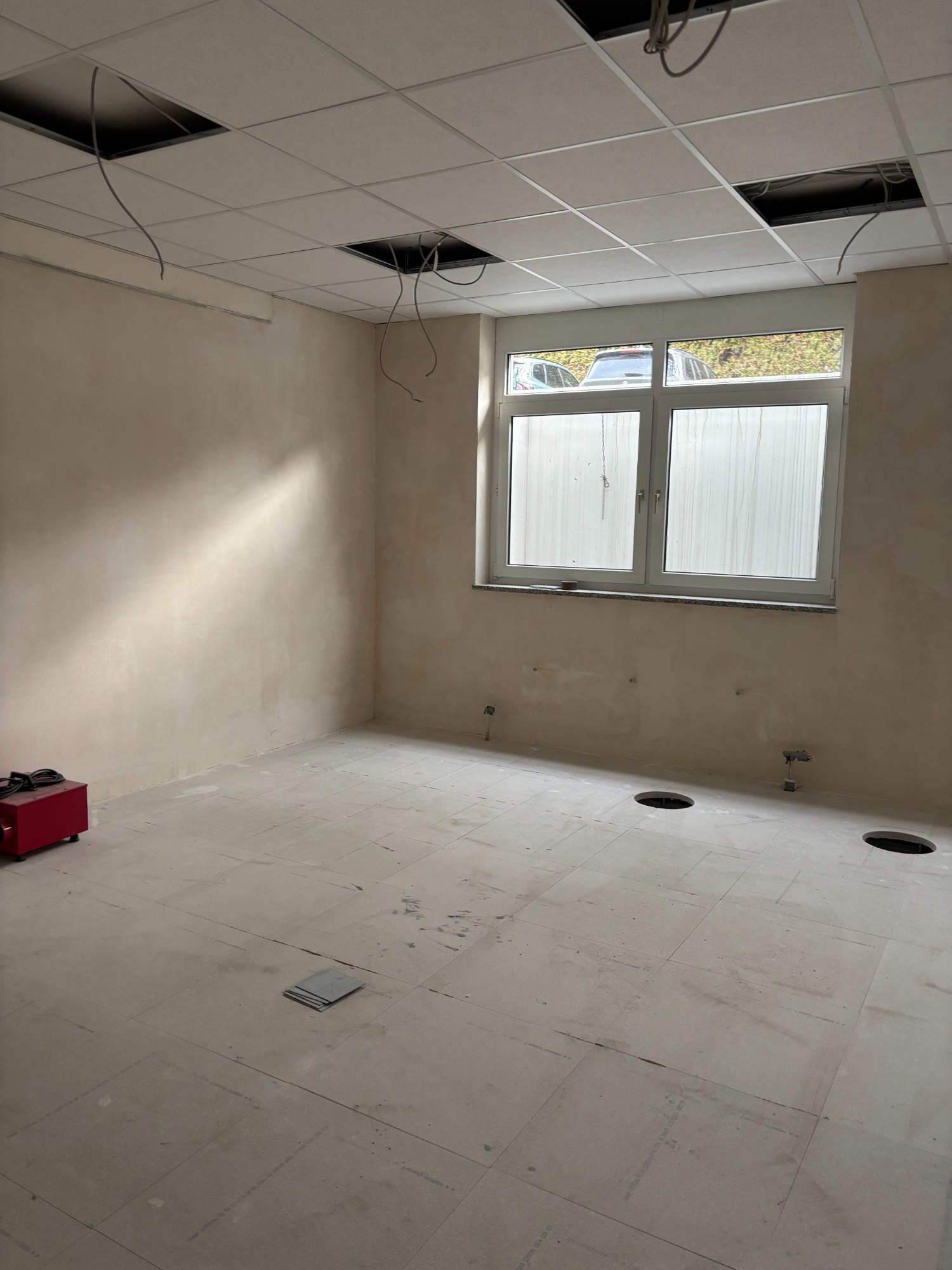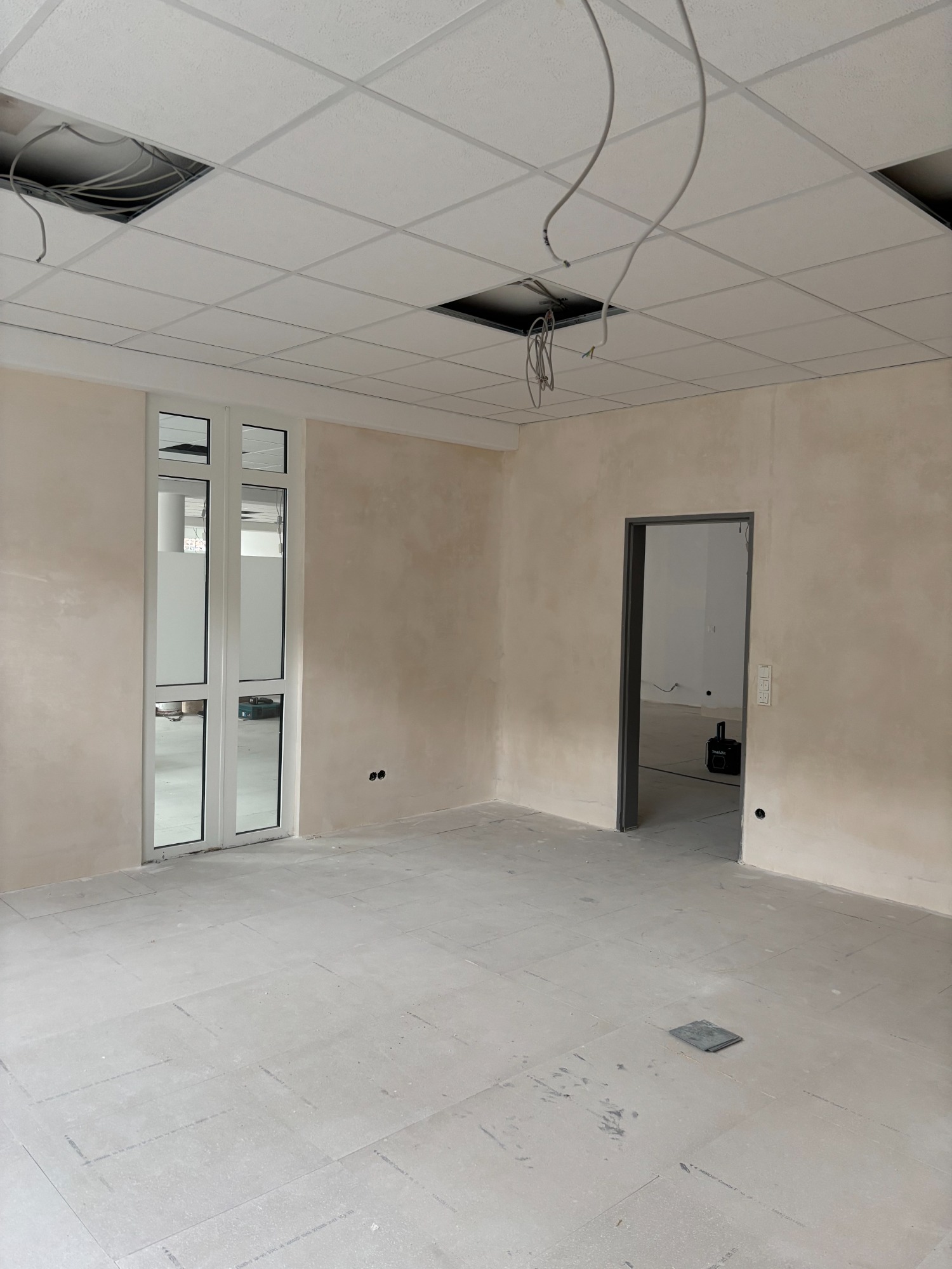 Sanierung von Büroeinheiten nach Wasserschaden: Aufbau von Gipskartonwänden, Decken- und Wandflächen instand gesetzt, gespachtelt und mit Malervlies tapeziert sowie gestrichen. Umsetzung für größere Büroeinheiten – alles aus einer Hand.
