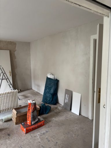 Sanierung einer großen Altbauwohnung: Wände und Decken zunächst vollflächig verputzt und sauber verspachtelt, anschließend mit Rauhfaser tapeziert und in einem klaren Weißton gestrichen. Türzargen, Türen sowie alle Holzelemente wurden hochwertig weiß lackiert, ebenso die Heizkörper. Ein edler Parkettboden mit hochwertigen weißen Sockelleisten sorgt für ein stimmiges Gesamtbild und unterstreicht den modernen Altbau-Look. Alles aus einer Hand.